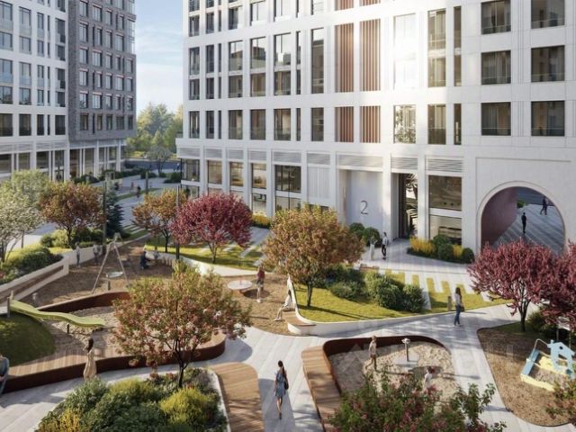 Двор без машин со своей инфраструктурой - кафе, магазины, салоны красоты и прочее.