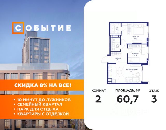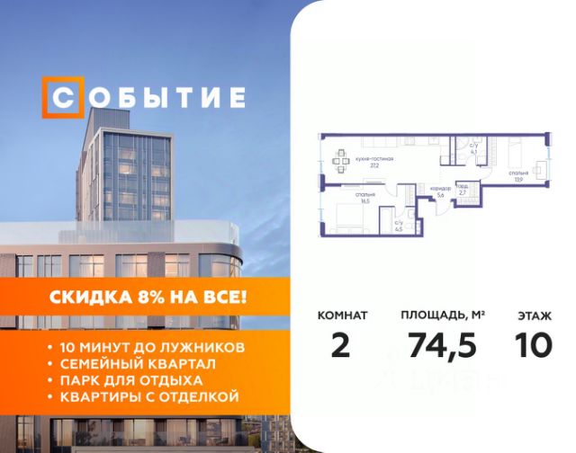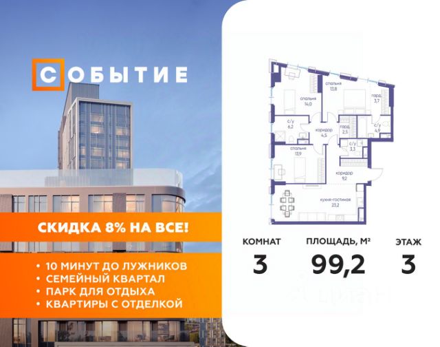 5 дней до окончания акции "Скидка 8%" Весь март - скидка до 8% действует до 31.03.2026 г. при 100% оплате и не субсидированной ипотеке! В продаже 2-к квартира от застройщика. Общая площадь 59.80, жилая 30.00, кухня 18.3. Квартира расположена на 2 этаже жилого квартала "Событие-6", корпус 2, Секция 2. Квартира без отделки. Срок сдачи: 4 кв. 2029 года. СОБЫТИЕ.6 — финальный дом парк-квартала СОБЫТИЕ на Мосфильмовской. Переезжайте в уже сформированный квартал с готовой инфраструктурой и парком! Премиальный жилой комплекс в престижном районе Москвы предлагает стильную архитектуру, продуманное благоустройство и великолепно разнообразие общественных пространств. Свой парк прямо возле дома! Архитектура Архитектура СОБЫТИЯ.6 выполнена в ультрасовременном стиле московским бюро Atrium на основе дизайн-кода британских архитекторов LDA Design и UHA London. Дом отличает оригинальная геометрия фасадов, большое остекление и высокие лобби (до 6,2 м) с авторской мебелью и светильниками. Расположение Мосфильмовская улица (Раменки) — один из престижных районов Москвы. Близость к историческому и деловому центру, природным зонам Запада столицы. Транспортная доступность: • 10 мин до Москва-Сити и ТТК; • 15 мин до Садового кольца; • 25 мин до аэропорта Внуково; • 7-10 мин до станций метро "Аминьевская" и "Мичуринский проспект". Инфраструктура: • парк "Событие" (12 га, финалист конкурса Правительства Москвы) с беговыми (1,5 км) и велодорожками (2,7 км), экотропой (1,6 км), площадками, лекторием; • школа, детский сад, магазины, салоны красоты, рестораны (к моменту заселения); • мультидвор с игровыми и спортивными площадками, мини-бульваром; • общественная терраса на 10-м этаже (коворкинг, лаунж); • Закрытые общественные пространства: детская комната, спортивный зал, коворкинг, лаунж-зоны. Паркинг 256 мест для жителей (48 — для электромобилей), 24 гостевых (5 — для электромобилей), мойки колес, кладовые, зоны для велосипедов. Окружение Парки и заповедники (Воробьёвы горы, Матвеевский лес и др.), МГУ, театр им. Н. И. Сац, стадион "Лужники". Безопасность Видеонаблюдение, контроль доступа, видеодомофоны, консьерж-сервис 24/7, системы пожарной безопасности и мультисервисная оптическая сеть.