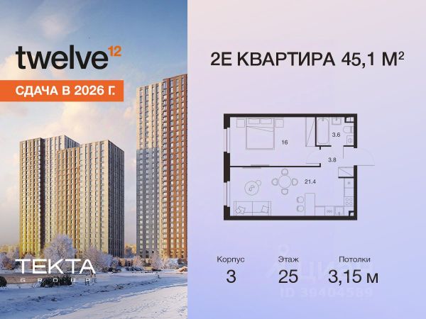 Рассрочка 0% с платежом от 120 000 ₽ в месяц. Сдача уже в 2026 году 2-комн. квартира в ЖК "Twelve" на 24 этаже в 34 этажном здании Корпус 1. Общая площадь: 43.6 кв.м., жилая: 27.90 кв.м. Высота потолков 3.15 м. ЖК Twelve от застройщика Tekta Group — это новый уровень жизни в районе Нагорный в 3-х минутах от станции метро. Проект представляет собой воплощение современной концепции комфортной жизни, где функциональность органично сочетается с эстетикой. Архитектура Twelve создает атмосферу, вдохновляющую на успех и располагающую к позитивным эмоциям. Дом, в котором каждый день будет наполнен уютом, а не рутинной работой и дорожными пробками. Twelve предлагает своим жильцам продуманные планировки, возможность объединения квартир, а также увидеть красоту города через угловое остекление увеличенных окон. Особое внимание уделено комфорту жителей: благоустроенная территория, зеленые насаждения, детские площадки, парковка. ЖК Twelve — это больше, чем просто жилье: это атмосфера умиротворенности, комфорта и гармонии.
