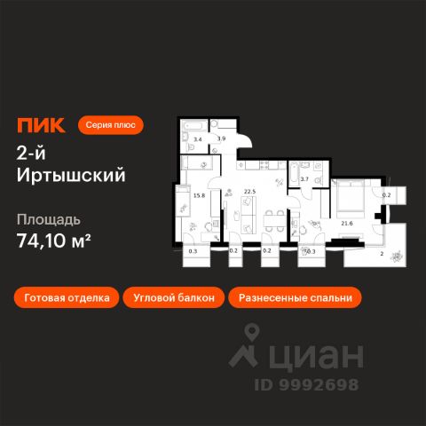 Продаётся 2-комн. квартира площадью 74,1 кв.м на 2 этаже 30 этажного дома (Корпус 1.3, Секция 3) проекта ПИК 2-й Иртышский. Светлый просторный подъезд на уровне земли, функциональная планировка, большие окна, c отделкой. "2-й Иртышский" возводится на востоке Москвы, между тремя станциями метро "Щелковская", "Черкизовская" и "Бульвар Рокоссовского". Проект включает жилые корпуса с индивидуальной архитектурой, школу и детский сад. Проект состоит из зданий разной высоты и разной по характеру архитектуры. Узнаваемой доминантой квартала станет башня из стекла и металла, напоминающая водопад. Квартал расположен в окружении нескольких знаковых рекреационных зон столицы. Вам понадобится всего несколько минут, чтобы оказаться в атмосфере спокойствия и слияния с природой. Всего 15 минут пешком, и вы в "Сиреневом саду", а дорога до национального парка "Лосиный остров" или Гольяновского пруда займёт 6 минут на авто. До Черкизовского детского парка и "Усадьбы Измайлово" можно доехать за 15 минут. До станции "Черкизовская" можно дойти пешком за 25 минут или доехать на общественном транспорте за 20. Дорога до станций "Бульвар Рокоссовского" и "Щёлковской" займёт 25 минут на общественном транспорте. Автомобилисты оценят удобные выезды на Щёлковское шоссе и СВХ. Путь до МКАД займет около 14 минут, до ТТК - 20. Артикул 961597 (Застройщик ООО "СЗ "Л-Девелопмент")