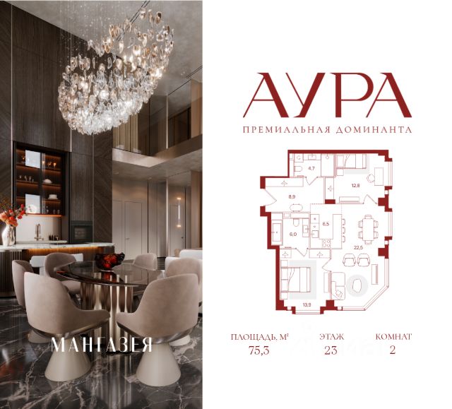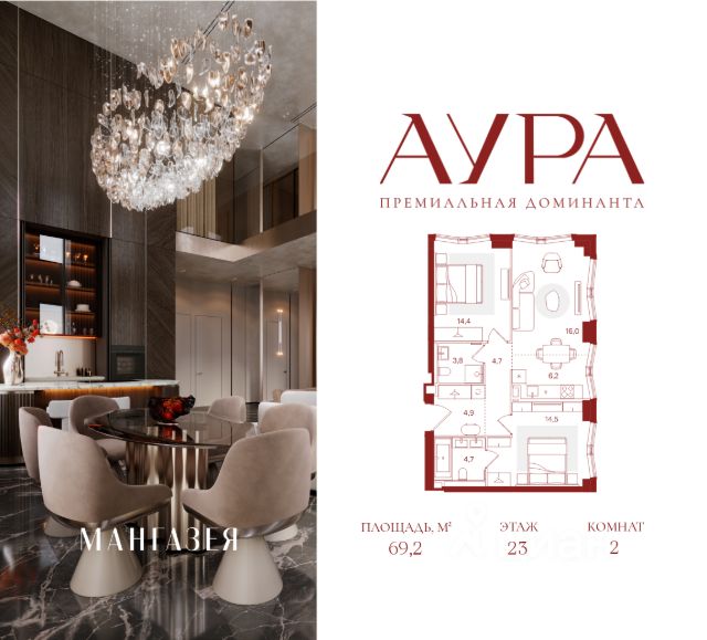 2-комнатная квартира площадью 57,2 м2. Высота потолков 3,16 м. Этаж 23 из 41. О проекте АУРА новая премиальная доминанта Москвы в 10 минутах от Садового кольца. Проект состоит из 42-этажной Бронзовой башни и 41-этажной Серебряной. Рядом набережная Москвы-реки, Даниловский рынок, музеи и галереи, престижные школы и вузы. Двор и благоустройство Приватная территория АУРЫ состоит из нескольких функциональных зон для тихого отдыха, работы и активного времяпровождения на свежем воздухе. На нижнем уровне расположены детские и спортивные площадки, скалодром и крытый павильон для подвижных игр. Выше — амфитеатр для отдыха и вечерних променадов, уличный коворкинг с мебелью и лаунж-зоны с лежаками у воды. На крыше — тихий уголок для занятий йогой, встречи рассветов и наслаждения закатами. По всему двору проложены пешеходные дорожки с подогревом в зимний сезон. Придомовую территорию АУРЫ украсит уникальный для Москвы объект — скала из натурального камня с водопадом, которая станет новой городской достопримечательностью. Эксклюзивная инфраструктура Только для резидентов: • Бьюти-комната • Коворкинг, переговорные и акустические кабинеты • Детская игровая комната • Спортзал и студия для тренировок • Просторные колясочные • Сервисная комната • Лапомойки для домашних питомцев Инфраструктура в составе проекта: • Ресторан авторской кухни • Современная медицинская клиника • Частный детский сад • Бизнес-центр класса "А" • Коммерческие помещения, закрывающие любые потребности — супермаркет, химчистка и др. Атрибуты комфорта • Индивидуальная вентиляция квартир • Вентиляция с очисткой воздуха в общих зонах • Мультизональное центральное кондиционирование (VRF) • Горячая вода круглый год • Вода качества, сопоставимого с питьевой • Усиленная звукоизоляция квартир Входные группы • Гранд-лобби в стиле современной роскоши • Дизайнерские лобби в каждой башне • Панорамное остекление Квартиры Более 40 планировок: от уютных студий до просторных семейных лотов. Всего 916 квартир площадью от 28,1 до 148,8 м². Высота потолков от 3,16 до 6,2 м. Уникальные планировки: • Квартиры с террасами • Квартиры с окном в ванной • Квартиры с круговым остеклением • Двухуровневые пентхаусы Паркинг и келлеры Двухуровневый подземный паркинг на 563 парковочных места: • Постоянные места: 496 (в том числе 48 мест для маломобильных) • Гостевые места: 67 • Персональные кладовые и велостанция • Мойка автомобилей • Станция для подкачки шин • Зарядки для электромобилей • Зона для разгрузки крупногабаритных предметов Интеллектуальные системы • Персональный бесконтактный доступ на территорию и в здание по электронному ключу (Bluetooth/RFID) • Премиальные лифты Mitsubishi • Автоматический въезд на паркинг для резидентов по распознаванию номеров • Круглосуточное видеонаблюдение с возможностью push-уведомлений • Система датчиков для круглосуточного мониторинга • Усиленный сигнал связи — стабильный прием сотовой связи и интернета на всей территории Сервис • Управляющая компания д