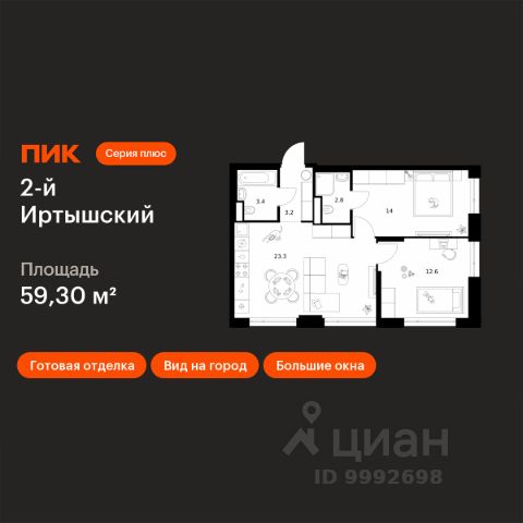 Агентам не звонить! Продается квартира на последнем 20м этаже корпуса 1.7 в ЖК 2-ой Иртышский, срок сдачи 1 кв 2028 г. ПИК серия плюс. Последний 20 этаж, вид в сторону зеленых насаждений. В квартире целых 5 окон, поэтому из одной просторной спальни можно сделать спальню и детскую/кабинет. Пространство будет очень светлое, а так как окна в пол, оно будет визуально увеличиваться. Планировка уникальная! Два санузла. Чистовая отделка. Окна в пол! О проекте 2-й Иртышский — квартал Серии плюс в окружении 5 крупных парков. Рядом — три станции метро и МЦК Локомотив. В проекте корпуса с индивидуальной архитектурой, школа и детский сад.