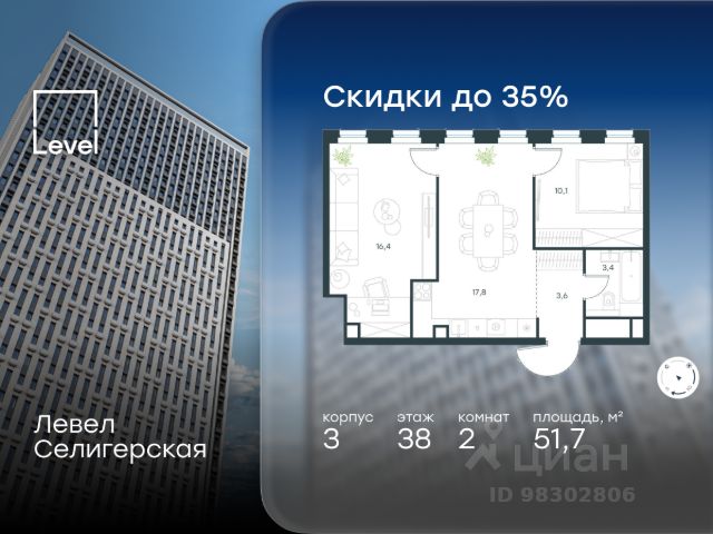 Цена указана с учётом скидки при 100%-й оплате, несубсидированной ипотеке, рассрочке (кроме программы "Рассрочка 0%"). В жилом квартале, расположенном в южной части района Западное Дегунино, продаётся 2-комнатная квартира площадью 51.70 кв.м без отделки. Квартира расположена на 38 этаже 40-этажного корпуса 3 в жилом комплексе комфорт-класса Левел Селигерская (компания Level Group/Левел групп). Отличная транспортная доступность: - 10 мин. пешком до станции метро "Верхние Лихоборы"; - 15 мин. пешком до станции метро "Селигерская"; - 20 мин. пешком до станции МЦД-3 "Моссельмаш"; - 11 мин. на авто до МКАД; - 13 мин. на авто до ТТК; - 16 мин. на авто до Садового кольца. Расположение Район отличается богатой социальной инфраструктурой: школы, детские сады, поликлиники, магазины, фитнес-клубы, торговые центры - всё близко к дому. Рядом с Левел Селигерская расположено 5 парковых зон. В 3 минутах от дома расположен перспективный сквер-парк. В 10 минутах пешком находится парк им. Святослава Фёдорова, в 13 минутах на велосипеде - парк "Ангарские пруды". В 7-11 минутах на автомобиле - два крупных природных объекта: Тимирязевский парк и Главный ботанический сад Российской академии наук. Благоустройство Внутренние дворы жилого комплекса огорожены от машин, а их функциональное наполнение отличается в зависимости от очереди строительства. На территории 2-й очереди жителей ждут уютные навесы с качелями, павильон-читальня, волейбольная площадка, беседки, а также детские и спортивные площадки. Технологии и инженерия Для входа на территорию комплекса предусмотрен единый ключ доступа. Все общественные зоны оснащены камерами видеонаблюдения, по заявке собственнику предоставляется возможность просмотра изображения отдельных видеокамер на его мобильном устройстве. При въезде в паркинг функционирует система распознавания госномеров. Кроме того, для комфорта жителей создано мобильное приложение, с помощью которого можно удаленно контролировать доступ на придомовую и жилую территории. Другие преимущества жилого комплекса - Высокая освещённость квартир: в большинстве из них не менее трёх окон; - Супермаркет, магазины, кафе, пекарни и многое другое на первых этажах домов; - Частный детский сад; - Стильные дизайнерские лобби с высокими потолками до 4,3 м. и окнами в пол, для питомцев предусмотрена лапомойка; - 30+ планировочных решений: от компактных студий до просторных семейных квартир; - С каждого этажа дома на лифте можно спуститься в подземный отапливаемый паркинг."
