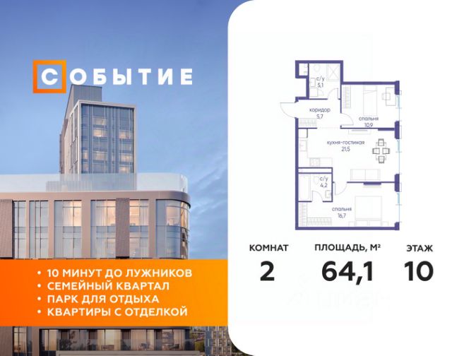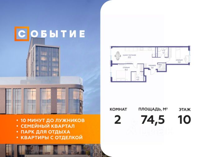 В продаже 2-к квартира от застройщика. Общая площадь 59.10, жилая 26.40, кухня 16.6. Квартира расположена на 7 этаже жилого квартала "Событие-6", корпус 2, Секция 3. Квартира без отделки. Срок сдачи: 4 кв. 2029 года. СОБЫТИЕ.6 — финальный дом парк-квартала СОБЫТИЕ на Мосфильмовской. Переезжайте в уже сформированный квартал с готовой инфраструктурой и парком! Премиальный жилой комплекс в престижном районе Москвы предлагает стильную архитектуру, продуманное благоустройство и великолепно разнообразие общественных пространств. Свой парк прямо возле дома! Архитектура Архитектура СОБЫТИЯ.6 выполнена в ультрасовременном стиле московским бюро Atrium на основе дизайн-кода британских архитекторов LDA Design и UHA London. Дом отличает оригинальная геометрия фасадов, большое остекление и высокие лобби (до 6,2 м) с авторской мебелью и светильниками. Расположение Мосфильмовская улица (Раменки) — один из престижных районов Москвы. Близость к историческому и деловому центру, природным зонам Запада столицы. Транспортная доступность: • 10 мин до Москва-Сити и ТТК; • 15 мин до Садового кольца; • 25 мин до аэропорта Внуково; • 7-10 мин до станций метро "Аминьевская" и "Мичуринский проспект". Инфраструктура: • парк "Событие" (12 га, финалист конкурса Правительства Москвы) с беговыми (1,5 км) и велодорожками (2,7 км), экотропой (1,6 км), площадками, лекторием; • школа, детский сад, магазины, салоны красоты, рестораны (к моменту заселения); • мультидвор с игровыми и спортивными площадками, мини-бульваром; • общественная терраса на 10-м этаже (коворкинг, лаунж); • Закрытые общественные пространства: детская комната, спортивный зал, коворкинг, лаунж-зоны. Паркинг 256 мест для жителей (48 — для электромобилей), 24 гостевых (5 — для электромобилей), мойки колес, кладовые, зоны для велосипедов. Окружение Парки и заповедники (Воробьёвы горы, Матвеевский лес и др.), МГУ, театр им. Н. И. Сац, стадион "Лужники". Безопасность Видеонаблюдение, контроль доступа, видеодомофоны, консьерж-сервис 24/7, системы пожарной безопасности и мультисервисная оптическая сеть. Продам 2-комнатную квартиру в ипотеку в новостройке в районе Раменки в Москве.