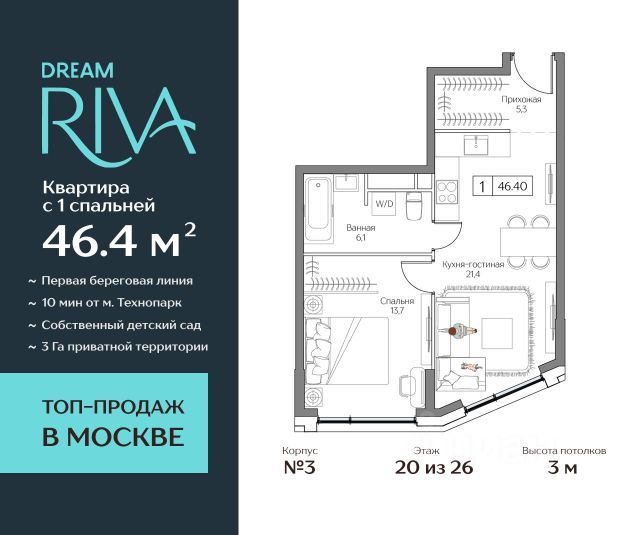 Квартира в премиальном квартале Dream Riva — первая линия Москвы-реки Продается квартира в прибрежном квартале Dream Riva на территории курортной локации "Остров мечты". 46.6 кв.м, 2 комнат, 2 этаж. Высота потолков 3,1 м. • 95% квартир Жемчужной коллекции смотрят на воду • Мастер-спальня с гардеробной • Естественный свет в гостиной с двух сторон ЛОКАЦИЯ И ТРАНСПОРТ • 15 минут на авто до Садового кольца, • 30 минут до Москва-Сити и Кремля. • 10 минут до метро "Технопарк" в пешей доступности. В перспективе — станция "Остров мечты" (2028г.). ИНФРАСТРУКТУРА КВАРТАЛА • 3 Га приватного двор-парка с зонами для спорта, йоги и отдыха; • Благоустроенная набережная с гастропроменадом; • Клубные лобби с инфраструктурой; • Премиум SPA-центр с бассейном и фитнес-клуб; • Государственный детский сад под окном и школа в 10 минутах от квартала; • Подземный и гостевой паркинг. ПРИВИЛЕГИИ РЕЗИДЕНТОВ • Пляжный клуб Dream Beach Club; • Яхт-клуб Dream Marine Resort; • Вейк-клуб; • Парк развлечений "Остров мечты"; • 44 Га парков для прогулок и спорта в окружении квартала. БЕЗОПАСНОСТЬ И КОМФОРТ • Приватная территория; • Охрана; • Видеонаблюдение; • Консьерж-сервис 24/7; • Современные инженерные системы и технологии умного дома. НАДЕЖНЫЙ ЗАСТРОЙЩИК Regions Development — успешная девелоперская компания. За 20 лет работы реализовали уже более 30 проектов в сегментах коммерческой и многофункциональной недвижимости. Скидки действуют только при 100% оплате и ипотеке Скидки действуют только при 100% оплате, ипотеке и рассрочке. Скидки и акции не суммируются. Звоните, чтобы договориться о просмотре!