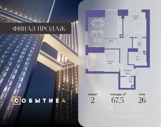 Продаются апартаменты с сервисом 5* отеля на 5-м этаже общей площадью 104.2 метров с 1-ой спальнями и кухней-гостиной. Дом готов.