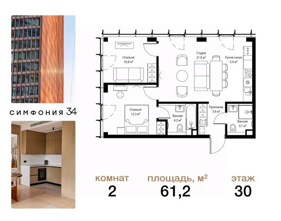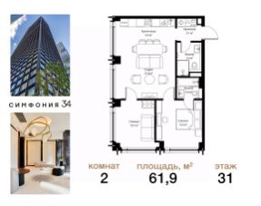 Дом сдан. Ключи в день покупки! В продаже 2-комнатная квартира площадью 70.20 м² с предчистовой отделкой на 7 этаже 49 этажного дома в корпусе Кристал. ЖК Симфония 34 - концептуально новый жилой комплекс премиум-класса с подземной парковкой, состоит из четырех башен высотой 36 - 54 этажа. Квартиры сдаются с базовой (предчистовой) отделкой MR BASE или дизайнерской чистовой отделкой MR READY. Высота потолков 3 - 6 метров, окна высотой до 2,6 м. Более 100 кладовых в подземной части ЖК и более 500 на этажах. Безопасность - Система контроля входа на территорию комплекса, биометрия - Система автоматического водяного пожаротушения и противопожарного водопровода, система пожарной вентиляции - Доступ на парковку при помощи системы распознавания автомобильных номеров, карточка для контроля доступа резидентов - Система видеонаблюдения - Круглосуточная связь через приложение, телефон, голосовые сообщения с охраной, консьержем, call-центр. Расположение Пешком - 6 минут до метро "Дмитровская" - 15 минут до Тимирязевского парка На машине - 5 минут до Савеловского вокзала и Аэроэкспресса в Шереметьево - 10 минут до Москва-Сити и Садового кольца Благоустройство - 70% территории отведены под зеленые насаждения и ландшафтный дизайн - Приватный Японский сад - Детские площадки с зонированием по возрасту - Clubhouse для резидентов - Wellness & SPA - Зона для пикника, зона с гамаками - Центральное лобби, ресторан, коммерческие помещения - Дополнительный вход/выход на территорию комплекса Окружение - В 10 минутах от Симфония 34 находится дизайн-завод Flacon, где регулярно проходят культурно-образовательные и развлекательные мероприятия - Тимирязевский парк расположен в 850 м. Площадь парка 232 га - Рядом расположен парк "Дубки", площадью 16,5 га. - В 15 минутах расположен Хлебозавод 9. Здесь находятся шоурумы брендов, кафе разных кухонь мира, образовательные проекты и площадки для мероприятий Компания MR предлагает своим клиентам специальные условия приобретения квартир в рамках программ ипотечного кредитования от банков-партнеров.