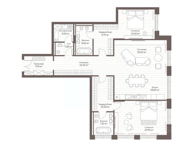 • 3 Спальни, кабинет, просторная гостиная, гардеробные при каждой