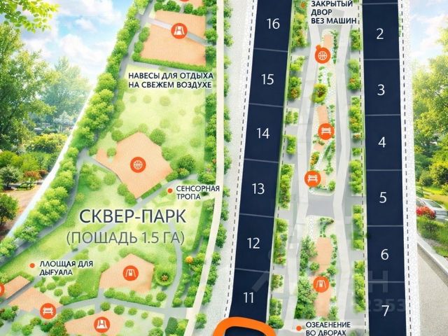 Благоустройство: Внутренние дворы жилого комплекса огорожены от машин, а их функциональное наполнение отличается в зависимости от очереди строительства. На территории 2-й очереди жителей ждут уютные навесы с качелями, павильон-читальня, волейбольная площадка, беседки, а также детские и спортивные площадки.