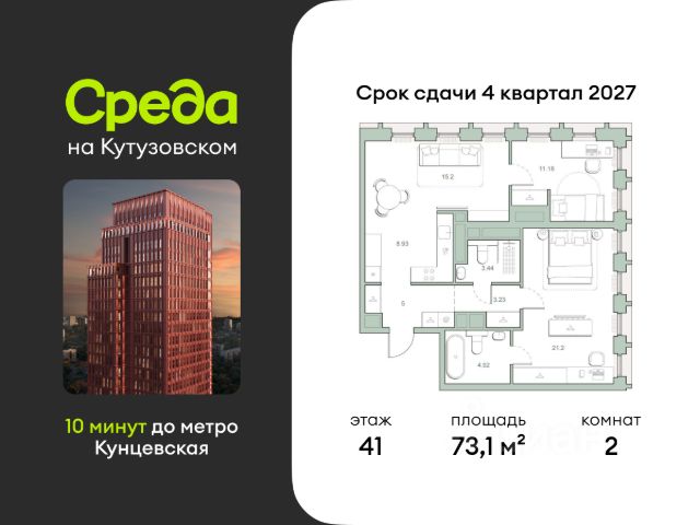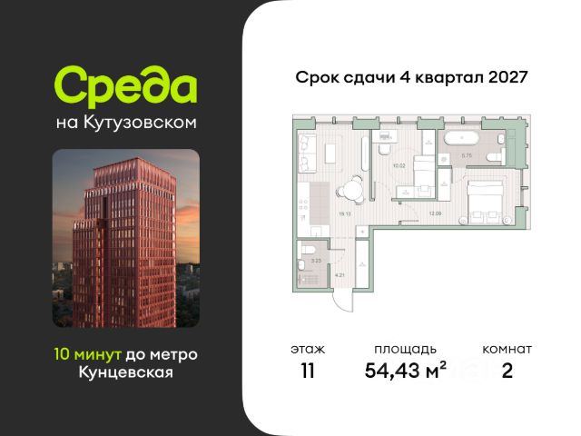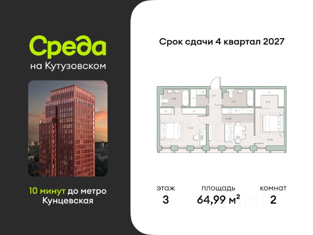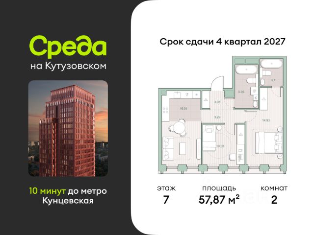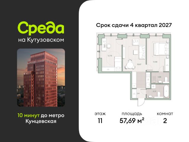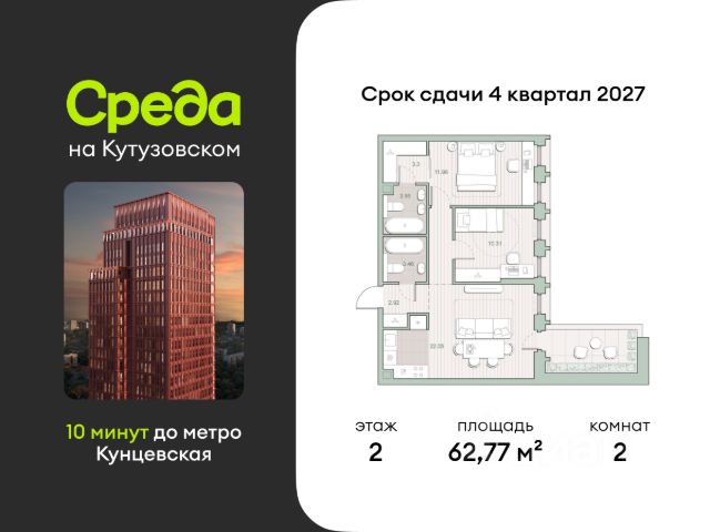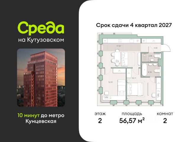 О квартире Продаётся двухкомнатная квартира общей площадью 56.86 кв. м. с отделкой на выбор: черновая, White Box. Квартира на 25 этаже корпуса 5 в жилом комплексе бизнес-класса "Среда на Кутузовском". До метро "Кунцевская" 10 минут пешком. Исторический зелёный район "Среда на Кутузовском" строится в Кунцево - историческом и экологически чистом районе Москвы. Здесь нет крупных производств, много лесных массивов и роза ветров, которая обеспечивает приток чистого воздуха. Район наполнен жизнью и уже развит: много детских садов и школ, поликлиники, магазины, кафе, спортивные объекты, парки. - 10 минут пешком до станции метро "Кунцевская". - 5-8 минут на машине до Кутузовского проспекта и Можайского шоссе и 10-15 минут до Рублёвского и МКАД. - 15 минут езды до Крылатских холмов, Суворовского парка и заказника "Долина реки Сетунь". Акции и спецпредложения - Выгода 12%: если внести 100% оплату или оформить семейную ипотеку под 6%. Действует до 13 апреля. - Низкие ставки по ипотеке: 0,1% в первый год или 0,11% в первые два года кредита. - Трейд-ин от "Среды": можно обменять свою текущую квартиру на новую. - Ипотека для семей с детьми: если ребёнку до 7 лет, предлагаем льготную ставку 3,5% О жилом комплексе "Среда на Кутузовском" - новый квартал с башнями от 12 до 44 этажей, окружённый лесными массивами и историческими усадьбами старой Москвы. Во внутреннем дворе есть водоём, многоуровневые зоны с детскими и спортивными площадками, коворкинг на свежем воздухе и локации для уединённого отдыха. Особенности - Архитектура с многослойными фасадами. - Квартиры с террасами и мастер-спальнями. - Окна в пол на всех этажах. - Общественные лаунж-гостиные. - Собственный ландшафтный парк во дворе. - Зоны барбекю и площадки для отдыха у воды. - Умный подземный паркинг. - Стрит-ритейл на первых этажах. 2-комнатная квартира в новостройке в районе Кунцево в Москве.