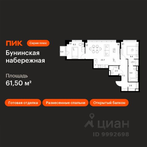 В жилом комплексе, расположенном по соседству с ландшафтным парком "Южное Бутово", продается 2-комнатная квартира площадью 53.10 кв. м. без отделки. Квартира расположена на 9 этаже 1 корпуса в жилом квартале комфорт-класса "Новые Смыслы" (ГК Unikey/Юникей). Доступная и удобная локация: - 10 минут ходьбы до станции метро "Потапово". - 25 минут ходьбы до станции метро "Бунинская аллея". - 15 минут на авто до Калужского шоссе. - 20 минут на авто до МКАД. - 30 минут на машине до аэропортов "Внуково" и "Остафьево". Продуманный архитектурный проект: - Разноуровневые секции с эстетичные башнями и контрастными цветовыми сочетаниями, напоминающими башни в Сити. - Сказочные виды из окон на современный район столицы. - Авторские планировки с потолками в 3 метра, просторными кухнями-гостиными и мастер-спальнями. - Комфортные бесплатные общественные пространства. - Подземный паркинг с прямым доступом на лифте. - Настоящий лес с живописными пейзажами и прудом прямо во дворе. Расположение Комплекс "Новые Смыслы" расположится в благоприятном районе Новой Москвы - Коммунарка. Зеленое окружение, богатая инфраструктура развивающегося района - все это сформирует особое пространство для комфортной жизни, наполненной смыслом. 10 минут на велосипеде - и вы в ландшафтном парке "Южное Бутово" или сквере у Потаповских прудов. Чуть дальше расположен Бутовский лесопарк. В окружении "Новых Смыслов" вы найдете все необходимые социальные объекты. В двух шагах от дома находится 5 школ, более десятка детских садов, секции для занятий малышей и подростков, частные клиники, супермаркеты, рестораны, студии красоты и фитнес-центры. За 12 минут на авто вы доберетесь до ледовой арены, комплекса "Спорт Станция" и спа-центра "Termoland". Внутренняя инфраструктура Для жителей "Новых Смыслов" будут созданы бесплатные общественные пространства: - Деловая гостиная с эстетичным коворкингом и переговорными. - Гостиная для души и тела, включающая фитнес-зону с тренажерами и пространства для стретчинга, йоги и медитаций. - Гостиная детства, где дети будут играть и развиваться под присмотром тьютора. - Кино-гостиная - кинотеатр на крыше одного из домов, предлагающий разнообразную программу. - Прачечная, работающая только для жильцов. Вместе с корпусами комплекса на территории запланировано строительство детского сада. На первых этажах корпусов откроются кофейни, пекарни, сервисы быта и пункты доставки. Благоустройство Чтобы отдохнуть от суеты города, достаточно выйти во двор: здесь раскинулся настоящий лес с живописными пейзажами. В тени деревьев жителей ждут пруд с мостиком и беседкой на берегу, тихие прогулочные аллеи, спортивная площадка и зоны для занятий йогой и бадминтоном на свежем воздухе. Юных жителей порадуют современные детские площадки, жукарий и специальное пространство для подвижных игр. Безопасность на территории гарантирована: двор огорожен от машин и оснащен камерами видеонаблюдения. Продается 2-комнатная квартира в новостройке рядом с метро Бунинская аллея.