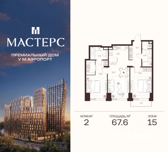МАСТЕРС — премиальный дом в престижной северной части Москвы, всего в 15 минутах езды от Кремля. Непосредственная близость к метро "Аэропорт" обеспечивает превосходную транспортную доступность. Это идеальный баланс приватности, природы и динамики столицы. Приватный двор: атмосфера загородного отеля Приватный двор — продолжение жилого пространства с атмосферой роскошного загородного отеля. Натуральные материалы, всесезонный сад из более чем 600 деревьев и кустарников. Во дворе — авторская мебель индивидуального производства, пергола с водной чашей и развивающая детская площадка. Вечерняя ландшафтная подсветка создаёт неповторимый уют. Линейный парк: природа мастерства Современный парк гармонично сочетает природу и инфраструктуру. Здесь сохранены десятки взрослых деревьев. Для детей — игровые площадки и сенсорные тропы. Для взрослых — места для отдыха и спорта, коворкинг и амфитеатр, а также площадка для йоги и аптекарский огород. Квартиры: мастерство внутри Более 100 вариантов планировочных решений — для максимальной индивидуальности. Угловые форматы квартир и панорамное остекление наполняют пространство светом. Доступны квартиры с мастер-спальнями, террасами, гардеробными и ванными с окном. Лобби: форма вдохновения Двухсветное мастер-лобби площадью 160 м² впечатляет эффектным панорамным остеклением и дизайнерской парадной лестницей. Клубная гостиная трансформируется под разные форматы мероприятий. Для деловых встреч здесь предусмотрены коворкинг и акустическая кабина для звонков. Во всех лобби расположены лаундж-зоны, колясочные, зарядки для самокатов и лапомойки. Паркинг: мастерство в деталях* Двухуровневый паркинг на 363 места и индивидуальные кладовые площадью от 4 до 6 м² для хранения вещей. Инфраструктура для повседневного комфорта включает зарядные станции для электромобилей, мойку колёс и подкачку шин. 2-комнатная квартира в новостройке рядом с метро ЦСКА.