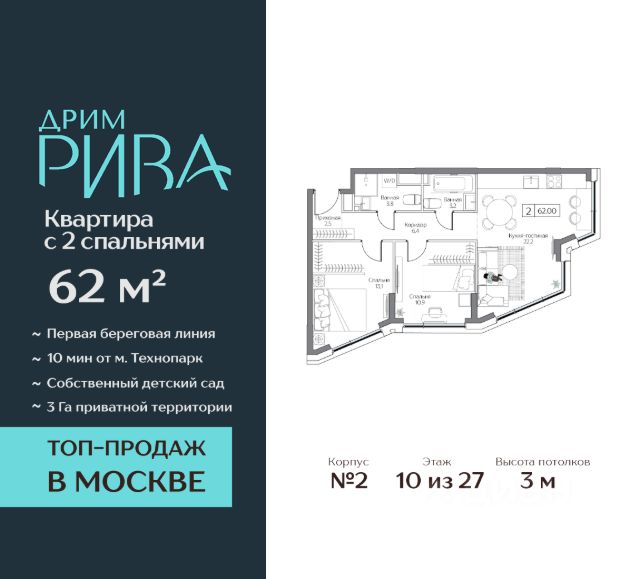 Рассрочка 0% от застройщика. Ключи в день покупки. ЖК Dream Towers — проект премиум-класса в окружении парков и набережной, с полностью готовой инфраструктурой для комфортной жизни и отдыха. Продаётся 2-квартира на 6 этаже 6-этажного дома (3 корпус). Общая площадь: 57.1 кв.м. Высота потолков от 3.15 м. Город-курорт на 100 Га в шаге от вашего дома: • пляжный комплекс Dream Beach Club; • парк аттракционов Остров Мечты; • 44 Га ландшафтных парков; • пешеходная набережная; • яхт-клуб; • Южный речной вокзал; • вейк-парк и многое другое. В Dream Towers предусмотрено все для комфортной жизни с семьей: • дизайнерские лобби с общественной гостиной, колясочной и лапомойками; • охраняемый благоустроенной двор только для жителей; • собственный десткий сад и школа прямо во дворе; • красивая архитектура зданий в стиле Ар-деко; • облицовка фасадов из натурального камня с архитектурной подсветкой; • широкоформатное остекление окон в пол для лучших видовых характеристик на парки и пойму Москвы-реки; • подземный паркинг; • клубный формат проживания; • эргономичные планировки от 40 до 162 м2; • высокие потолки от 3,15 до 4,1 м; • квартиры с террасами; • вся необходимая инфраструктура на первых этажах домов, а также в торговой частия тематического парка "Остров Мечты" (рестораны, кафе, супермаркет, магазины, салон красоты, йога-студия и многое другое). Центр рядом: 15 минут до Садового кольца на авто, 20 минут до Сити или Кремля. В 5 минутах прогулочным шагом — станция метро "Технопарк"