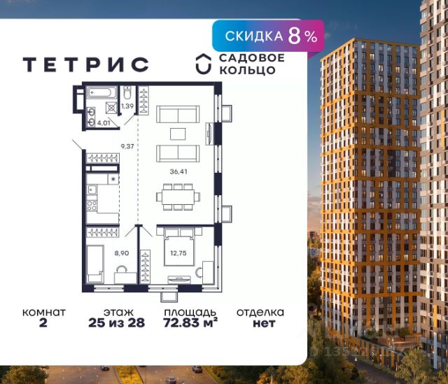 Успейте забронировать по акционной цене! Стоимость квартиры указана со скидкой, ваша выгода составит 1585963 рублей. Предложение ограничено. Звоните, чтобы узнать подробнее! Продается квартира в ЖК Тетрис с 2 спальнями на 24 этаже 28 этажного дома. Общая площадь: 73.01 кв.м. Высота потолков 2.95 м. Срок сдачи 2 квартал 2026 г. Эскроу-счет. Застройщик ГК "Садовое кольцо". Семейный жилой комплекс "Тетрис" с собственной развитой инфраструктурой, благоустроенным двором и функциональными планировочными решениями. Собственный двор-парк, детские и спортивные площадки. Продуманные зоны отдыха с ландшафтным дизайном. Охраняемая дворовая территория и круглосуточное видеонаблюдение. Рядом удобная транспортная развязка и станция МЦД Павшино. ЖК "Тетрис" объединяет все важнейшие факторы, формирующие комфорт: Просторный обустроенный двор — место, где весело проводить время с друзьями и семьей. Свой торговый центр, чтобы любая мелочь была под рукой. Удобная локация и транспортная доступность. Свои медицинский центр и школа с блоком начальных классов. Жилой комплекс "Тетрис" обеспечит вам идеальное пространство для жизни, где все необходимое под рукой. Благодаря этому вы получаете самый драгоценный ресурс - время на общение с друзьями и семьей, заботу о себе и личное развитие.