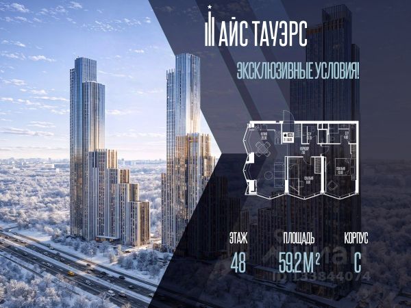 2-комн. квартира в ЖК "Ever" на 4 этаже в 34 этажном здании Корпус 5. Общая площадь: 55.4 кв.м., жилая: 29.5 кв.м. Высота потолков 3.00 м.