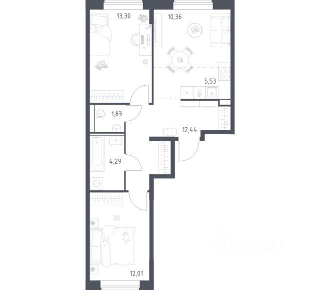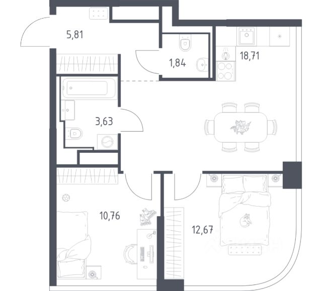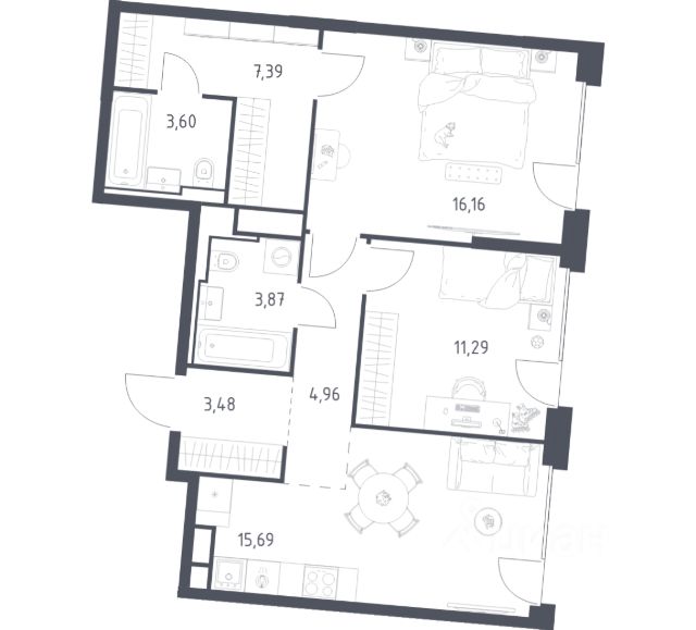 Проектная площадь с учетом лоджии составляет 66.18 м², жилая: комната 1-16,85 м², комната 2-15,98 м², лоджия- 3,90 м².