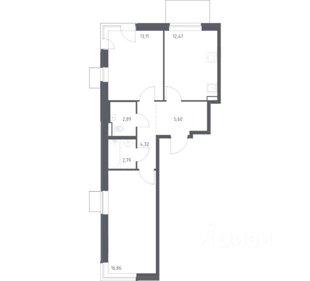 Общая плoщадь 57,54 м², жилaя плoщадь 28,80 м², кухня 13.86 м², 2 изолированные комнаты 13.20 м² и 15.60 м², прихожая 4.89 м², коридор 4.30 м², санузел раздельный.