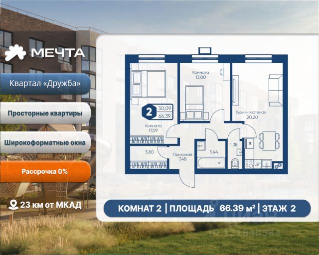 Рассрочка 0% от застройщика! Продается двухкомнатная квартира в квартале "Дружба" жилого комплекса "Мечта". Общая площадь квартиры: 59.54 кв. м, этаж 5 из 5. Срок сдачи: 4 квартал 2027 г. Отделка: Чернова ОСОБЕННОСТИ: - Просторная кухня-гостиная - Продуманная планировка - Широкоформатные окна - 2 спальни - 2 санузла - Высота потолка: 2.7 метра Квартал "Дружба" состоит из пяти пятиэтажных домов с несколькими подъездами. Каждый дом оборудован широкими окнами, которые обеспечивают максимальный доступ естественного света и открывают прекрасный вид на окружающую природу. Квартал отличается большими застеклёнными лоджиями, которые позволяют наслаждаться свежим воздухом и красивым видом, не покидая своего жилища. Жилой комплекс "Мечта" расположен в 23 км от МКАД по Дмитровскому или Ленинградскому шоссе. ТРАНСПОРТНАЯ ДОСТУПНОСТЬ: - 15-20 минут на общественном транспорте до МЦД-1 "Лобня" - 30-35 минут на общественном транспорте до метро "Физтех" - 45-50 минут до станций метро "Савеловская" или "Белорусская" - 30 минут на автомобиле до Москвы Инфраструктура включает в себя муниципальную школу и детские сады, кабинет врача общей практики, множество кафе и ресторанов, а также различные спортивные и детские площадки. В пешей доступности от жилого комплекса расположены лес и три реликтовых озера — Долгое, Круглое и Нерское, а также реки Альба, Уча и Волгуша. Территория жилого комплекса закрыта для посторонних, находится под охраной и патрулируется. На въезде расположен КПП. Камеры видеонаблюдения работают круглосуточно на всей территории. Вы и ваши дети будете чувствовать себя в безопасности.