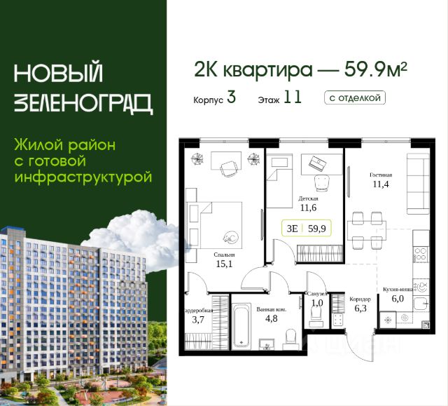 Арт. 117609948 Продается Евро 2х комнатная квартира, общей площадью 40,8 кв м. Расположена на 11 этаже 13 этажного дома в ЖК Молжаниново. Корпус 4, срок сдачи 2 квартал 2026 г., ключи до 30.09.2026г.
