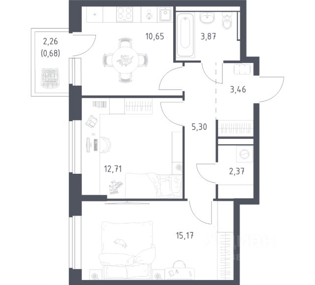 В продаже 2-комнатная квартира в корпусе 3.3 ЖК 'Егорово Парк'. Квартира располагается на 7 этаже, общая площадь 55.59 м2.