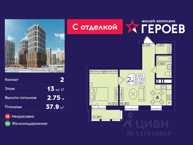 Продаётся 2-комнатная квартира 39.4 кв. м. в жилом комплексе "Героев" в Балашихе, Железнодорожный. Квартира расположена на 12 этаже 407 корпуса. Все квартиры представлены с чистовой отделкой. Вам не нужно тратить время и дополнительные финансы на ремонт или жить в шуме строительных работ - достаточно перевести свои вещи, расставить мебель и всё готово! Жилой квартал "Героев" - это уютный проект для семей с детьми. Всего 40 минут до центра Москвы. В квартале созданы все условия для досуга всех возрастов: игровые и спортивные площадки, места для отдыха и прогулок, магазины, кафе и пункты выдачи. За 15 минут можно дойти от дома до Ольгинского лесопарка - популярного места для прогулок и отдыха на свежем воздухе. Здесь приятно гулять всей семьёй, заниматься спортом или устроить пикник в выходной день. Преимущества: Квартира с готовой отделкой. Пространство полностью подготовлено для жизни: не нужно тратить время и деньги на ремонт или ждать его окончания. После получения ключей достаточно расставить мебель - и можно сразу заезжать и жить. Продуманные и светлые планировки. Просторные кухни-гостиные создают комфортное пространство для отдыха и встреч с близкими. В квартирах предусмотрены удобные гардеробные, благодаря чему легко поддерживать порядок и не перегружать комнаты шкафами. Увеличенное остекление. Большие окна наполняют квартиру естественным светом в течение всего дня, создавая ощущение простора и уюта, а также визуально расширяя пространство и делая интерьер более воздушным. Пешая доступность до станции Железнодорожная (МЦД-4) - дорога займёт не более 30 минут до центра Москвы: станции метро "Курская", "Площадь Ильича" или ТПУ Нижегородская.