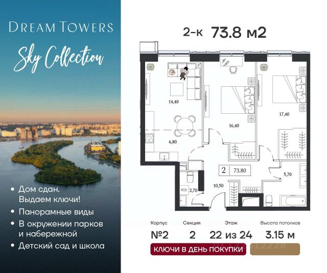 Увеличенный объем панорамного остекления создает неповторимое ощущения воздушности пространства! Двор-набережная с видами на гладь реки и кроны деревьев. Премиальный квартал DREAM RIVA — авторская архитектура в курортной концепции, воплощающей силу природных стихий в каждой детали оформления и благоустройства. Продаётся Квартира с 1 спальней квартира на 2 этаже 26-этажного дома (3 корпус). Общая площадь: 46.6 кв.м. Высота потолков от 3 м. Формат приватного досуга и эксклюзивные привилегии в DREAM RIVA с приоритетным доступом для резидентов: - Первая линия Москвы-реки с открытыми видами на воду и город; - 3 Га приватного прибрежного парка с зонами для спорта и йоги; - Открытый солярий; - Школа и собственный детский сад; - Многофункциональные детские игровые площадки и детское кафе с игровой комнатой; - Клубная гостиная и lounge-бар. Локация вне конкуренции — инфраструктура полуострова предлагает всё, что нужно для размеренной жизни, работы, отдыха и развлечений: - Благоустроенная набережная с гастрогалереей; - Парк аттракционов Остров Мечты (в торговой части: рестораны, кафе, супермаркет, магазины, салон красоты, йога-студия и многое другое); - 44 Га ландшафтных парков для прогулок, спорта, пикников; - Пляжный комплекс Dream Beach Club со множеством бассейнов, ресторанов, баров и развлечений для любого возраста; - Яхт-клуб; - Вейк-парк; - Кинотеатр под открытым небом и многое другое. Удобная транспортная доступность: - Центр рядом: 15 минут до Садового кольца на авто, 20 минут до Сити или Кремля; - В 5 минутах прогулочным шагом — станция метро "Технопарк"; - Южный речной вокзал. Наши менеджеры будут рады провести для Вас консультацию и подробнее рассказать о проекте. Успейте купить на лучших условиях! Продается 2-комнатная квартира в новостройке в районе Нагатинский затон в Москве.