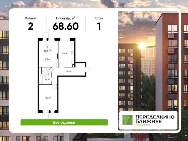 Первая линия домов у пруда! Продается готовая двухкомнатная квартира без отделки в городе-парке "Переделкино Ближнее". Общая площадь квартиры - 68,6 кв. м, этаж 1 из 12. Тип дома - монолитный. Город-парк "Переделкино Ближнее" расположен в 8 км от МКАД по Боровскому шоссе. В 7 минутах пешком от проекта расположена станция метро "Рассказовка" Солнцевской линии. В пешей доступности находится ж/д станция "Мичуринец". Добраться до центра Москвы можно за 30 минут. 16 фаза строительства уникальна своим расположением - на берегу пруда в двух шагах от современного парка "Переделкино Ближнее". Все жители 16 фазы смогут комфортно провести время рядом с домом: инфраструктура нового парка включает в себя благоустроенный пляж, площадки детского развития, современный спортивный кластер с пунктом проката инвентаря, велотрассу, памптрек, ресторан на воде, пирс, лодочную станцию. Современный монолитный дом переменной этажности, входные группы домов выполнены по авторскому дизайну. Первые этажи облицованы клинкерным кирпичом. На фасаде предусмотрены корзины для установки кондиционеров. Огороженный двор без машин, в каждом дворе будут установлены уникальные игровые и спортивные площадки, разработанные ведущими мировыми экспертами. На территории проекта есть все необходимые объекты социальной и бытовой инфраструктуры: 7 детских садов, 3 школы, магазины, паркинги, аптеки и др. Купить 2-комнатную квартиру в новостройке в округе НАО (Новомосковский) в Москве.