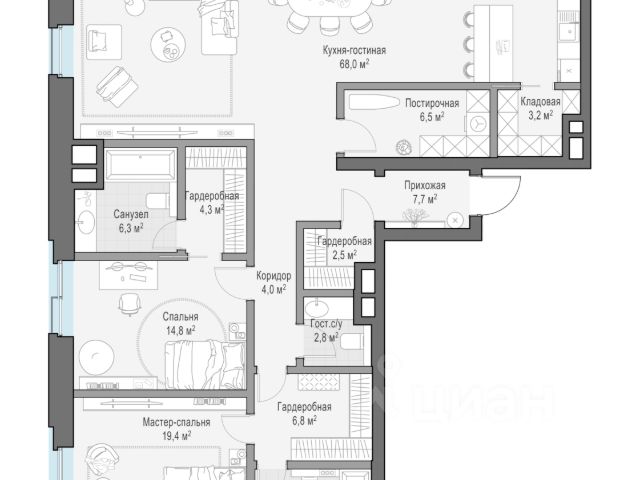 Квартира с 1 мастер-спальней общей площадью 114 м2 расположена на 3-м этаже жилого дома "Никитский 6". Из окон открывается вид на Никитский бульвар, Дом союза журналистов. Планировочное решение включает панорамную кухню-гостиную, 1 мастер-спальню с личной гардеробной и ванной комнатой, а также функциональные сервисные пространства. Во всех квартирах предусмотрена высококачественная авторская отделка с кухонной мебелью, бытовой техникой и полностью оборудованными ванными комнатами. В интерьере предложены природные оттенки и натуральные премиальные материалы: дерево, различные породы камня, элементы металла. Интеграция ультрасовременных инженерных систем с элементами управления smart home и multiroom. "Никитский 6" расположен в одном из культовых районов столицы — на Арбате, на пересечении Никитского бульвара и улицы Воздвиженка. В пешей доступности от дома находятся всемирно известные культурные достопримечательности, образовательные учреждения, зеленые бульвары для прогулок, модные рестораны и бутики Никитской улицы и всего пять минут до Александровского сада. Для дополнительного комфорта резидентов "Никитский 6" предусмотрена клубная инфраструктура: просторное комфортабельное лобби, зал для частных занятий йогой и пилатесом, библиотека и комната для переговоров. На трех подземных уровнях дома расположен просторный паркинг с увеличенными габаритами машино-мест, скоростными зарядками для электромобилей, кладовыми и сервисными помещениями для персонала.