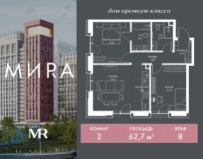 Продаётся 2-комнатная квартира общей площадью 58.56 м² без отделки в доме премиум-класса МИRА на 14-м этаже 23 этажного дома. Квартира расположена в корпусе 2.