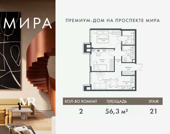 Продаётся 2-комнатная квартира общей площадью 56.56 м² без отделки в доме премиум-класса МИРА на 12-м этаже 23 этажного дома. Квартира расположена в корпусе 2.