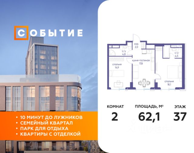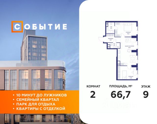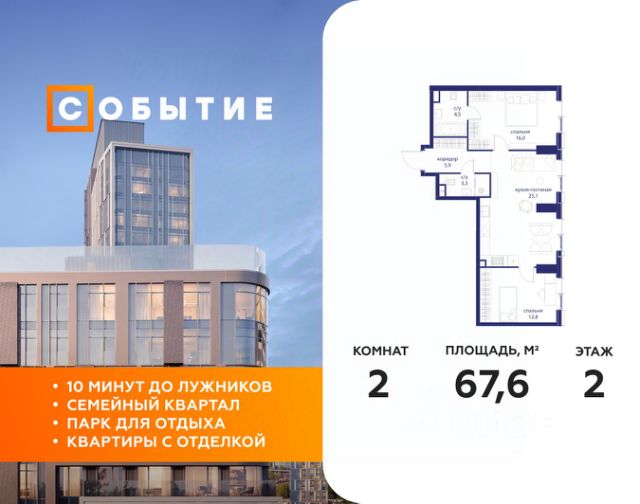 В продаже 2-к квартира от застройщика. Общая площадь 59.10, жилая 26.40, кухня 16.6. Квартира расположена на 7 этаже жилого квартала "Событие-6", корпус 2, Секция 3. Квартира без отделки. Срок сдачи: 4 кв. 2029 года. СОБЫТИЕ.6 — финальный дом парк-квартала СОБЫТИЕ на Мосфильмовской. Переезжайте в уже сформированный квартал с готовой инфраструктурой и парком! Премиальный жилой комплекс в престижном районе Москвы предлагает стильную архитектуру, продуманное благоустройство и великолепно разнообразие общественных пространств. Свой парк прямо возле дома! Архитектура Архитектура СОБЫТИЯ.6 выполнена в ультрасовременном стиле московским бюро Atrium на основе дизайн-кода британских архитекторов LDA Design и UHA London. Дом отличает оригинальная геометрия фасадов, большое остекление и высокие лобби (до 6,2 м) с авторской мебелью и светильниками. Расположение Мосфильмовская улица (Раменки) — один из престижных районов Москвы. Близость к историческому и деловому центру, природным зонам Запада столицы. Транспортная доступность: • 10 мин до Москва-Сити и ТТК; • 15 мин до Садового кольца; • 25 мин до аэропорта Внуково; • 7-10 мин до станций метро "Аминьевская" и "Мичуринский проспект". Инфраструктура: • парк "Событие" (12 га, финалист конкурса Правительства Москвы) с беговыми (1,5 км) и велодорожками (2,7 км), экотропой (1,6 км), площадками, лекторием; • школа, детский сад, магазины, салоны красоты, рестораны (к моменту заселения); • мультидвор с игровыми и спортивными площадками, мини-бульваром; • общественная терраса на 10-м этаже (коворкинг, лаунж); • Закрытые общественные пространства: детская комната, спортивный зал, коворкинг, лаунж-зоны. Паркинг 256 мест для жителей (48 — для электромобилей), 24 гостевых (5 — для электромобилей), мойки колес, кладовые, зоны для велосипедов. Окружение Парки и заповедники (Воробьёвы горы, Матвеевский лес и др.), МГУ, театр им. Н. И. Сац, стадион "Лужники". Безопасность Видеонаблюдение, контроль доступа, видеодомофоны, консьерж-сервис 24/7, системы пожарной безопасности и мультисервисная оптическая сеть. Купить 2-комнатную квартиру в новостройке в районе Раменки в Москве.