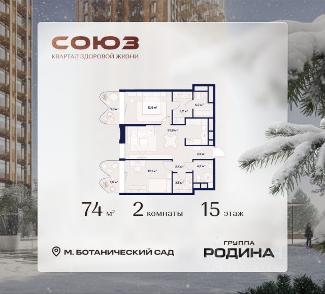 Рассрочка 0% Продаётся 2-комнатная квартира площадью 62 м² на 9 этаже в Жилом Комплексе "Союз". Квартал здоровой жизни премиум-класса с рекордным количеством олимпийских видов спорта: - Ледовая арена для хоккея и фигурного катания, - Футбольные поля для тренировок, - Спортивный зал для фехтования, - Бассейн на 6 дорожек, - Центр единоборств, - 4 крытых площадки для настольного тенниса, - 7 теннисных кортов (крытых и открытых), - 4 крытых площадки для сквоша, - Легкоатлетический стадион, - Площадки для баскетбола и волейбола. Уникальные форматы квартир с мастер-спальнями, приватными террасами, балконами, а также пентхаусы с открыточными видами на город. Все квартиры продаются с отделкой Shell&Core и панорамным остеклением. Расположение Пешком: - 2 мин. до парка "Сад Будущего"; - 6 мин. до ст. м. "Ботанический сад"; - 6 мин. до ст. МЦК "Ботанический сад"; - 6 мин. до парка "Леоновская роща"; На автомобиле: - 2 мин. до СВХ (МСД); - 5 мин. до Проспекта Мира; - 10 мин. до ТТК; - 15 мин. до Садового кольца; - 25 мин. до аэропорта "Шереметьево". Благоустройство - собственная спортивная инфраструктура 7 Га; - зона для пикников; - игровые и спортивные площадки для детей всех возрастов; - розарий, а также сосновые, каштановые и дубовые аллеи; - площадки под открытым небом для занятий спортом и йоги; - игровые комнаты для детей; - лаунж-зона для резидентов; - просторная переговорная для деловых встреч; - премиальный ресторан "Шабада" Сосо Павлиашвили с водными арт-объектами на прогулочной аллее, садом ароматных трав и сценой под открытым небом; - кафе, химчистки, аптеки и супермаркеты рядом с домом. Окружение - 8 парков: Сад Будущего, Леоновская роща, Хуамин, Главный ботанический сад РАН, Шереметьевская дубрава, Останкино, парк спорта "Яуза", пойма реки Яуза и музей-усадьба "Останкино"; - 3 ВУЗа: ВГИК, РГСУ, МГПУ; - 12 школ, в том числе: школа 1499 им. И.А. Докукина (топ 100), Brookes Moscow, IThub школа; - 18 детских садов, в том числе билингвальный ALERTUM KIDS; - один из крупнейших океанариумов Европы "Москвариум"; - один из крупнейших в Европе торгово-развлекательных центров "Европолис".