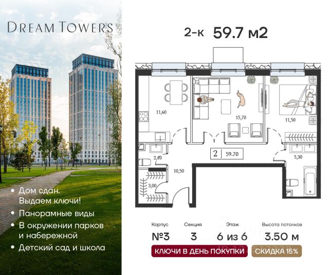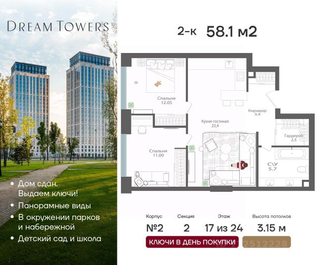 Продаётся 2-комнатная квартира в доме ЗИЛАРТ СПАРК общей площадью 56.8 кв. метров на 6 этаже. ЗИЛАРТ СПАРК — новый проект бизнес-класса в жилом квартале "ЗИЛАРТ". Дом, состоящий из трех 43-этажных башен с общим пятиэтажным основанием, сочетает в себе современную архитектуру, передовые технологии и восхитительные виды на ландшафтный парк "Тюфелева Роща" и бульвар Братьев Весниных. По соседству находятся музейно-выставочный центр "Коллекция" и трехэтажный универмаг "ЗУМ". ЗИЛАРТ СПАРК находится в Даниловском районе Москвы. В шаговой доступности — три станции метро ("Автозаводская", "Тульская", "ЗИЛ") и платформа МЦК. На автомобиле также можно быстро добраться до центра города. В пешей доступности есть вся необходимая инфраструктура: супермаркеты, салоны красоты, уютные кафе и рестораны, спортивные студии, места для досуга, отдыха и развлечений. На благоустроенной набережной Марка Шагала располагается действующий причал "ЗИЛ". Проект "ЗИЛАРТ" разработан ведущими архитекторами страны и мира, при этом все они соблюдают единый дизайн-код. ЖК "ЗИЛАРТ" представляет собой 30 домов с эксклюзивной архитектурой, 17 из которых уже сданы и заселены. Квартал обеспечен социальной и общественной инфраструктурой, появились новые улицы и объекты благоустройства. Жилой комплекс даст возможность прогуляться по живописной набережной, просторному парку и бульвару. Любители здорового образа жизни и спортсмены оценят современные площадки для спортивных игр и фитнес-центр с бассейном. Молодые родители будут спокойны за настоящее и будущее детей благодаря современной образовательной среде. В "ЗИЛАРТе" расположена одна из самых больших школ России на 2,5 тысячи учеников. Помимо основного образования, дети могут дополнительно посещать "Кванториум" и множество кружков, заниматься спортом и хореографией. Весной 2020 года "ЗИЛАРТ" стал победителем Всероссийского конкурса в области жилищного строительства в номинации "Лучший жилой комплекс-новостройка в Российской Федерации". Звоните и бронируйте квартиру в новом доме ЗИЛАРТ СПАРК! Продам 2-комнатную квартиру в новостройке станция ЗИЛ (МЦК).