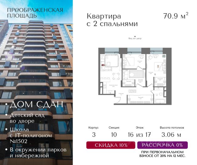Рассрочка 0% от застройщика. Первоначальный взнос от 20%. Предложение действует до 31 января 2026 года Квартира на 2 этаже в жилом комплексе премиум-класса "Преображенская площадь". Общая площадь: 68.1 кв.м. Проект премиум-класса в историческом районе Москвы. До метро "Преображенская площадь" 3 минуты пешком. Квартиры сдаются без отделки и в свободной планировке, чтобы жители могли оформить пространство с учетом своей индивидуальности. Высота потолков от 3,15м, широкоформатное остекление, 3-5 квартир на этаже. Система Умный дом. Дизайнерские лобби. Внутренний двор 1,5 га функциональное и безопасное пространство для игр, работы и занятий спортом. Пешеходный променад для прогулок. Дома переменной этажности. Есть подземный паркинг. Жилой комлекс находится в окружении парков Сокольники, Черкизовский, Измайловский, заповедника Лосиный остров и ВДНХ, а также вблизи пешеходной набережной. Комфортная удаленность от центра: 7 минут на автомобиле до ТТК, 8 минут до Садового кольца, 25 минут до Кремля.