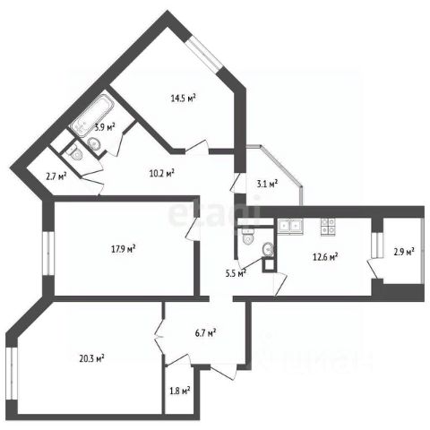 Одна большая спальня 16.5 кв.м и кухня-гостиная 31 кв. м, ванная 5.5 кв.м.