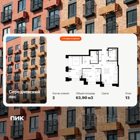 Квартира находится на 13 из 14 этажей во 2 корпусе, 5 секция.