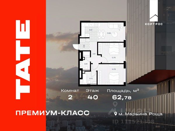 Указанная акционная стоимость доступна при 100% оплате или ипотеке без субсидирования. Цена действует до 31.12.2025 23:49:59. Стоимость без акции 33885818. Продается 2-комнатная квартира от застройщика в ЖК премиум-класса TATE на 15 этаже. Общая площадь 59,6 м². Отделка предчистовая (white box). 2 санузла. Вид из окна на Парк Останкино/ВДНХ, Парк сокольники. Угловое остекление. Мастер-спальня. Башня A. Срок сдачи: 2 кв. 2027 Выдача ключей: 4 кв. 2027 Проект расположен на границе с ЦАО в районе Марьина Роща на улице Веткина. В шаговой доступности находится метро Марьина роща (5 минут), парки "Останкино" и "Сокольники" (15 минут). До центра столицы время в пути составит 15 минут на авто. На территории премиум квартала откроют спа- и фитнес-центр, бассейн, оборудуют детские и спортивные площадки. Предусмотрен подземный двухуровневый паркинг с контролем доступа и лифтом на жилые этажи. Паркинг рассчитан на 568 машино-мест. Доступ в жилой комплекс осуществляется по биометрическому контролю - Face ID. Территория закрытая с видеонаблюдением и консьерж-сервисом 24/7. Особенности ЖК: - 2 башни высотой от 41 до 49 этажей. - Исторический район; - Панорамная лаундж-зона на высоте 140 м; - На 4041 этажах видовые пентхаусы площадью до 200 м²; - Два вида отделки: лаконичный и монохромный WhiteBox или готовые интерьеры с безупречным чувством меры - Лобби с потолками высотой почти 6 м; - В отдельном 6-этажном здании на территории будут: просторный фитнес-центр с бассейном, концептуальный ресторан, офисные пространства; - Детские зоны и спортивные площадки; - 6 скоростных лифтов; - Лапомойки для животных; - Безбарьерная среда.
