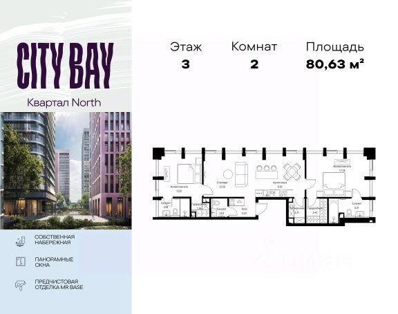 Прямая продажа от застройщика. Продаётся 2-комнатная квартира общей площадью 80.63 м² с предчистовой отделкой в ЖК City Вау, квартале North, на 3-м этаже 17 этажного дома. Концепция жилого комплекса City Вау - настоящий город в городе с отлично развитой инфраструктурой и собственной благоустроенной набережной. На территории жилого комплекса расположено пять кварталов - Atlantic, Pacific, Indian, North, Cliff. Жилой квартал City Вау отличается оригинальной концепцией и выделяется среди других проектов такими характеристиками как: - Архитектура, - Виды из окон, - Природное окружение, вызывая гордость у жителей и восхищение у прохожих. Вся жизнь района Покровское-Стрешнево строится вокруг водных объектов: - Пойма реки Сходни с уникальной экосистемой, - Речка Химка и Химкинское водохранилище, - Москва-река, - Канал имени Москвы. Кругом вода, и местные с удовольствием этим пользуются. А сразу за рекой - центр водного спорта в Строгино с вейк-парком и яхт-клубами. Помимо воды, здесь очень много зелени: - Рядом Сходненский ковш памятник природы, естественный амфитеатр глубиной 40 метров; - Парк при усадьбе Братцево с фруктовым садом; - Дубовая роща "Маяк", - Алешкинский лес; - Лесопарк Покровское-Стрешнево с пляжами и бобрами. Главные транспортные артерии района: - Волоколамское шоссе, - Таганско-Краснопресненская линия метро и МЦД-2. Всего за 20 минут можно добраться до центра на машине или метро, а МЦД связывает ЖК City Вау с северными, восточными и юго-восточными районами. Компания MR предлагает своим клиентам специальные условия приобретения квартир в рамках программ ипотечного кредитования от банков-партнеров. Продается 2-комнатная квартира в новостройке на шоссе Волоколамское в Москве.