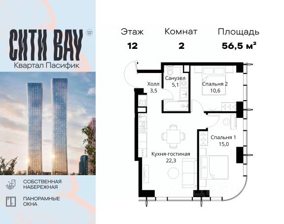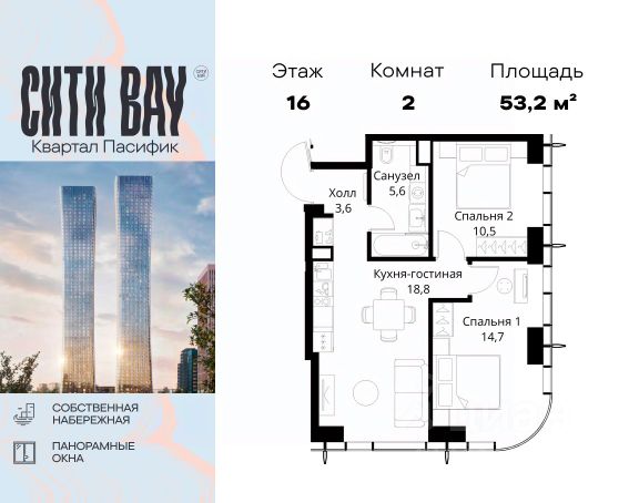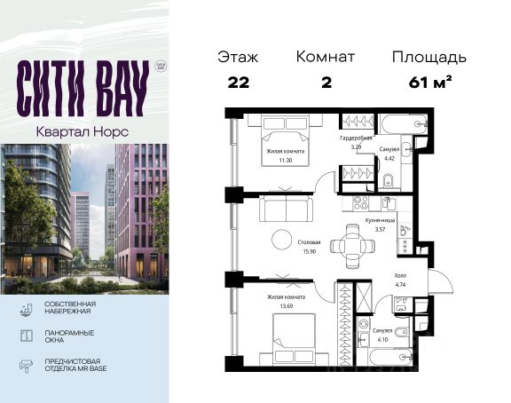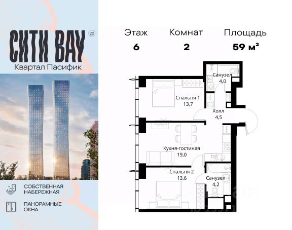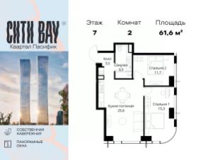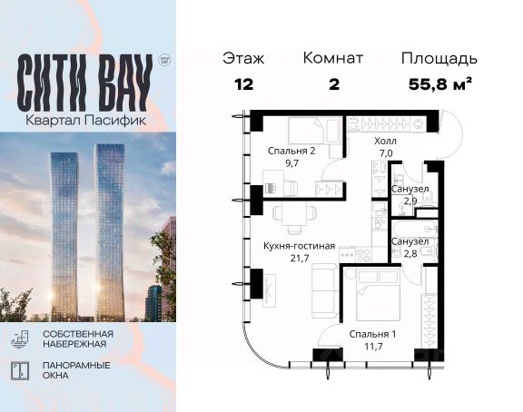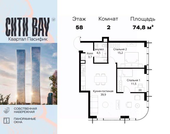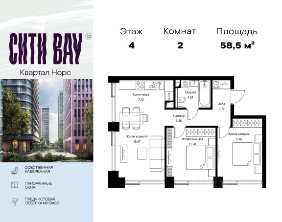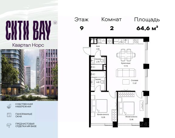 Прямая продажа от застройщика. Продаётся 2-комнатная квартира общей площадью 74.68 м² с предчистовой отделкой в ЖК Сити Бэй, квартале Норс, на 21-м этаже 27 этажного дома. Концепция жилого комплекса Сити Бэй - настоящий город в городе с отлично развитой инфраструктурой и собственной благоустроенной набережной. На территории жилого комплекса расположено пять кварталов - Атлантик, Пасифик, Индиан, Норс, Клиф. Жилой квартал Сити Бэй отличается оригинальной концепцией и выделяется среди других проектов такими характеристиками как: - Архитектура, - Виды из окон, - Природное окружение, вызывая гордость у жителей и восхищение у прохожих. Вся жизнь района Покровское-Стрешнево строится вокруг водных объектов: - Пойма реки Сходни с уникальной экосистемой, - Речка Химка и Химкинское водохранилище, - Москва-река, - Канал имени Москвы. Кругом вода, и местные с удовольствием этим пользуются. А сразу за рекой - центр водного спорта в Строгино с вейк-парком и яхт-Клубами. Помимо воды, здесь очень много зелени: - Рядом Сходненский ковш памятник природы, естественный амфитеатр глубиной 40 метров; - Парк при усадьбе Братцево с фруктовым садом; - Дубовая роща "Маяк", - Алешкинский лес; - Лесопарк Покровское-Стрешнево с пляжами и бобрами. Главные транспортные артерии района: - Волоколамское шоссе, - Таганско-Краснопресненская линия метро и МЦД-2. Всего за 20 минут можно добраться до центра на машине или метро, а МЦД связывает ЖК Сити Бэй с северными, восточными и юго-восточными районами. Компания MR предлагает своим клиентам специальные условия приобретения квартир в рамках программ ипотечного кредитования от банков-партнеров. Продается 2-комнатная квартира в новостройке на шоссе Волоколамское в Москве.