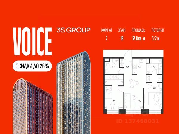 Ипотека от 3,5% на весь срок. Дополнительная скидка в офисе продаж! Продается уютная 2-комн. квартира площадью 48,3 кв.м на 3 этаже жилого комплекса бизнес-класса Voice Towers от 3S Group. Общая площадь: 48,3 кв.м., жилая: 32,4 кв.м., площадь кухни-гостиной: 18,6 кв.м., высокие потолки: 3,12 м., санузел совмещенный. О проекте: Voice. Высокие стандарты жизни Мы уверены, что высокие идеалы неизменно помогают достигать высот. Создавая Voice, мы ориентировались на людей с высокими требованиями к качеству и безупречным вкусом. Башни жилого комплекса, сочетают элегантную форму с динамичной геометрией фасадов, устремляются ввысь и отвечают самым высоким стандартам строительства. Технологичность, воплощенная в архитектуре - это ваш, собственный Voice. Преимущества локации Близость к метро Текстильщики, БКЛ и МЦК Новохохловская (10 мин) Рядом природный заповедник и конно-спортивная база Кузьминки-Люблино Будущее окружение Проект Южный порт - Текстильщики с деловым центром Сити-2 Небоскребы высотой до 300м Культурный центр с амфитеатром Променад вдоль Москвы-реки и яхт-клуб Архитектура Проект от Архитектурной мастерской Алексея Ильина Две перпендикулярные башни с арочными вершинами Высокая башня: светло-серый металл Низкая башня: терракотовая керамика Благоустройство Внешняя зона: парковки, магазины, кафе Внутренний двор: закрытая территория с озеленением Шумозащитный экран Сезонное озеленение Встречи на высоте Гранд-лобби высотой 8м Дизайнерская мебель Умные скоростные лифты Услуги Детский центр с игровой зоной Фитнес-студия для жителей