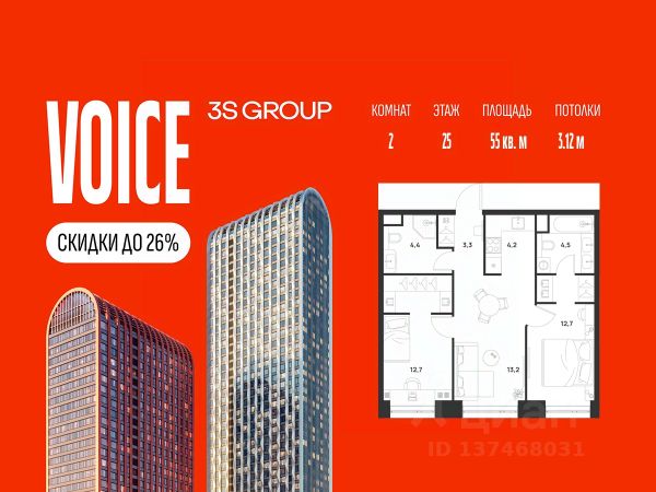 Ипотека от 3,5% на весь срок. Дополнительная скидка в офисе продаж! Продается уютная 2-комн. квартира площадью 55,6 кв.м на 5 этаже жилого комплекса бизнес-класса Voice Towers от 3S Group. Общая площадь: 55,6 кв.м., жилая: 35,5 кв.м., площадь кухни-гостиной: 17,3 кв.м., высокие потолки: 3,12 м., санузел совмещенный. О проекте: Voice. Высокие стандарты жизни Мы уверены, что высокие идеалы неизменно помогают достигать высот. Создавая Voice, мы ориентировались на людей с высокими требованиями к качеству и безупречным вкусом. Башни жилого комплекса, сочетают элегантную форму с динамичной геометрией фасадов, устремляются ввысь и отвечают самым высоким стандартам строительства. Технологичность, воплощенная в архитектуре - это ваш, собственный Voice. Преимущества локации Близость к метро Текстильщики, БКЛ и МЦК Новохохловская (10 мин) Рядом природный заповедник и конно-спортивная база Кузьминки-Люблино Будущее окружение Проект Южный порт - Текстильщики с деловым центром Сити-2 Небоскребы высотой до 300м Культурный центр с амфитеатром Променад вдоль Москвы-реки и яхт-клуб Архитектура Проект от Архитектурной мастерской Алексея Ильина Две перпендикулярные башни с арочными вершинами Высокая башня: светло-серый металл Низкая башня: терракотовая керамика Благоустройство Внешняя зона: парковки, магазины, кафе Внутренний двор: закрытая территория с озеленением Шумозащитный экран Сезонное озеленение Встречи на высоте Гранд-лобби высотой 8м Дизайнерская мебель Умные скоростные лифты Услуги Детский центр с игровой зоной Фитнес-студия для жителей
