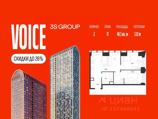 Ипотека от 3,5% на весь срок. Дополнительная скидка в офисе продаж! Продается уютная 2-комн. квартира площадью 44,4 кв.м на 11 этаже жилого комплекса бизнес-класса Voice Towers от 3S Group. Общая площадь: 44,4 кв.м., жилая: 28,7 кв.м., площадь кухни-гостиной: 14,7 кв.м., высокие потолки: 3,12 м., санузел совмещенный. О проекте: Voice. Высокие стандарты жизни Мы уверены, что высокие идеалы неизменно помогают достигать высот. Создавая Voice, мы ориентировались на людей с высокими требованиями к качеству и безупречным вкусом. Башни жилого комплекса, сочетают элегантную форму с динамичной геометрией фасадов, устремляются ввысь и отвечают самым высоким стандартам строительства. Технологичность, воплощенная в архитектуре - это ваш, собственный Voice. Преимущества локации Близость к метро Текстильщики, БКЛ и МЦК Новохохловская (10 мин) Рядом природный заповедник и конно-спортивная база Кузьминки-Люблино Будущее окружение Проект Южный порт - Текстильщики с деловым центром Сити-2 Небоскребы высотой до 300м Культурный центр с амфитеатром Променад вдоль Москвы-реки и яхт-клуб Архитектура Проект от Архитектурной мастерской Алексея Ильина Две перпендикулярные башни с арочными вершинами Высокая башня: светло-серый металл Низкая башня: терракотовая керамика Благоустройство Внешняя зона: парковки, магазины, кафе Внутренний двор: закрытая территория с озеленением Шумозащитный экран Сезонное озеленение Встречи на высоте Гранд-лобби высотой 8м Дизайнерская мебель Умные скоростные лифты Услуги Детский центр с игровой зоной Фитнес-студия для жителей