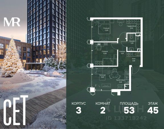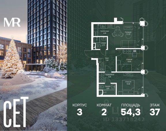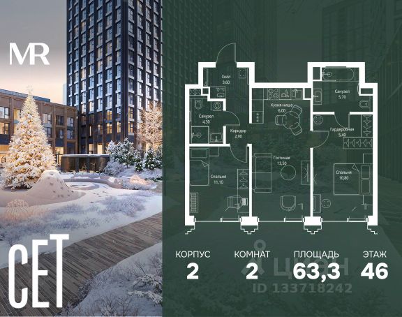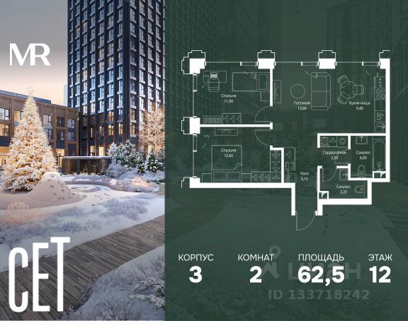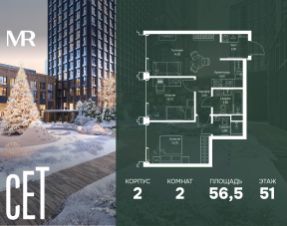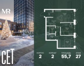 Прямая продажа от застройщика. В ЖК Сет продается 2-комнатная квартира площадью 62.50 м², расположенная в корпусе 3, на 12 этаже 45 этажного дома. Сет имеет стратегически выгодное расположение в ЗАО, в районе с большой историей и блестящим будущим: между природной зоной долины реки Сетунь и Кутузовским проспектом. В рамках возведения первой очереди предусмотрено три корпуса высотой 18, 45 и 59 этажей. На верхних этажах спроектированы общедоступные смотровые площадки с панорамным обзором на центр столицы. Преимущества проекта: • Функциональные планировочные решения • Контроль проникновения через входную дверь • Система управления освещением и температурой в квартире • Система защиты от протечек с функцией перекрытия воды • Вход в подъезд по биометрическим считывателям Face ID • Скоростные лифты • Двухуровневый подземный охраняемый паркинг на 495 машино-мест Застройка Сет включает в себя не только жилые корпуса, но и инфраструктурные объекты. Все необходимое для повседневного комфорта будет расположено в шаговой доступности: • Фитнес-клуб с бассейном • Ведущая городская школа, детский сад и школа искусств • Центр культуры и досуга • Медицинский центр • Кафе и рестораны Расположение комплекса: Пешком: • Метро "Давыдково" - 17 минут • Парк "Долина реки Сетунь" - 3 минуты • Открытие новых станций метро в шаговой доступности в будущем Инфраструктура: Разнообразить свой день резиденты Веер смогут также проводя больше времени на свежем воздухе. Двор разделен на 4 зоны разных эмоций и действий, которые пересечены и соединены веерными прогулочными маршрутами: • Спортивная площадка устроена в глубине ""Кленовой рощи"" • В ""Чайном домике"" будет создан навес с утеплением для отдыха в любую погоду • Площадки для детей воплотятся в ""Волшебный лес"" с цветами, зеркалами и световым дизайном • ""Центральная площадь"" устроена у водного оазиса живописного пруда. На машине: • "Москва-Сити" - 15 минут • Садовое кольцо - 20 минут • ТЦ "Океания" - 8 минут • ТЦ "Времена года" - 13 минут • Сколково - 12 минут • Гребной канал - 17 минут Компания MR предлагает своим клиентам специальные условия приобретения квартир в рамках программ ипотечного кредитования от банков-партнеров.