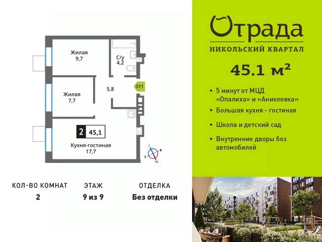 Беспроцентная рассрочка от застройщика. В продаже 2-комнатная квартира квартира площадью 55.5 м², расположенная на 3 этаже в жилом квартале "Станиславский" — проекте бизнес-класса на Новорижском шоссе, всего в 10 минутах от Москвы. В квартире 39 Дом 1 (Корпус 1.1, секция 2) высота потолков — от 3 метров, просторная планировка с гардеробной и большой кухней-гостиной создают комфорт и свободу для воплощения ваших идей. В проекте есть разнообразные отделочные решения, что позволяет реализовать любые дизайнерские предпочтения и планировочные идеи. В "Станиславском" представлены квартиры на любой вкус и для любой семьи: студии, классические и европланировки, а также крупные 4- и 5-комнатные варианты. Все помещения предлагаются без отделки, что дает свободу для создания уникального пространства. Обустроенная территория предусматривает функциональное зонирование: зеленые бульвары, природные тропы, интерактивные зоны, центральная площадь с подиумом для мероприятий и спортивный кластер. Для жителей предусмотрены разнообразные сценарии досуга: тихие зоны для общения, массажные тропы и сад ароматных трав для оздоровления, всесезонные уличные игры и открытые поляны для спортивных и настольных развлечений. Также есть познавательная зона с огородом, скворечниками и микроскопами. В концепции ЖК "Станиславский" особое внимание уделено въездной зоне: здесь создана комфортная площадка для встреч с гостями, обрамленная живой изгородью. Отсюда также открывается доступ к специально оборудованной территории для выгула питомцев — всё продумано для удобства и уюта жителей.