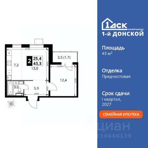 Прямая продажа от застройщика! Жилой Комплекс класса Комфорт Плюс. Продаётся 2-к квартира номер 447 общей площадью 43.3 кв.м. на 21-м этаже 24 этажного здания. Предчистовая отделка. Особенности квартиры: - МЦД-5 в пешей доступности - Квартал с собственной набережной - Свои 2 детских сада и школа - Организуем показ в удобное для вас время! - Линейная планировка - максимальная функциональность и удобство. - Евроформат - просторное и удобное жилье с отличной планировкой. - Кухня-гостиная - идеальное пространство для встреч с близкими. - Линейная кухня - функциональность и практичность в одном решении. - Лоджия - уютное место для отдыха и тишины. Квартира с предчистовой отделкой. Вам не придется заниматься черновыми и трудоёмкими работы, а чистовую отделку и дизайн - сделайте на свой вкус. Информация о комплексе: ЖК "1-й Донской" в 7 км от МКАД: гармония городского комфорта и природы. Квартиры на 2-3 стороны света, форма секций и разная этажность создают динамичную архитектуру. Тёплая палитра фасадов и подсветка подчеркивают образ. Рядом - Ермолинский парк, Видновский лесопарк и Жуковский парк. Природа воздействует на все уровни восприятия: от видов до звуков и ароматов. Идеальный баланс для жизни в гармонии с окружающей средой. Транспортная доступность: Комплекс удобно расположен в 7 км от МКАД по трассе М-4 Дон (через Видное). Расстояние до Каширского шоссе составляет 12 км. Добраться до метро и центра Москвы позволяет развитая сеть маршрутов общественного наземного транспорта. Действующая ж/д станция Калинина Павелецкого направления в 15-17 минутах ходьбы (МЦД-5 в 2025-2026 гг). Внутренняя инфраструктура: "1-й Донской": продуманная среда в развивающемся районе. На территории - муниципальные школа и 2 детских сада, поликлиника, торговый центр с площадью для мероприятий. Сеть пешеходных маршрутов ведёт к магазинам и кафе, отделённым от дорог зелёными фито-стенами. Сквозные подъезды с панорамным остеклением и входами с улицы и двора наполнены светом. Всё для комфортной жизни в шаговой доступности, от повседневных нужд до общественных пространств. Квартира с предчистовой отделкой - ваш дизайн без черновых работ