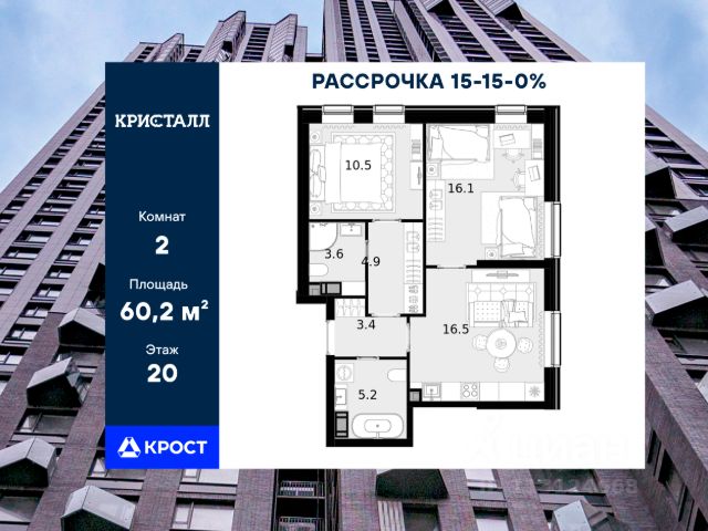 Двухкомнатная квартира площадью 60,2 кв.м. на 20 этаже дома бизнес-класса "Трилогия Кристалл". Жилой комплекс Трилогия Кристалл комфорт в сердце Хорошево-Мнёвников Удобное расположение и транспортная доступность CRYSTAL Трилогия расположен в престижном районе Хорошево-Мнёвники, на улице Генерала Глаголева, всего в нескольких минутах от живописного Серебряного бора и набережной Москвы-реки. Из окон открываются панорамные виды на воду и зелёные зоны, создавая ощущение гармонии с природой. Автомобильная доступность • Звенигородское шоссе и проспект Маршала Жукова быстрый выезд в любую часть города. • 7 км до ТТК, 9 км до МКАД, 10 км до Садового кольца. • Общественный транспорт: • Ближайшая станция метро "Народное ополчение" (2 км). Добраться можно пешком или на автобусе. • В пешей доступности строятся 3 новые станции метро, что повысит транспортную связанность района. Инфраструктура: всё для жизни в шаговой доступности Комплекс входит в состав масштабного квартала Union Park (40 га) это современная городская среда с продуманной инфраструктурой. Образование и развитие: • Лучшие школы Москвы: 1515, 1517, 138, Курчатовская школа. • Детские сады: "Wow Kids Серебряный бор", логопедический "ДАРвиль". • Музыкальная школа им. В. В. Андреева. Медицина и спорт: • Поликлиника "Семейный доктор", медцентр "Мед-Лайт", стоматология. • Спорткомплекс "Серебряный" с бассейном, тренажерным залом и солярием. Магазины и рестораны: • Премиальные магазины: "Азбука вкуса", "ВкусВилл", "Лента", "Магнолия". • Рестораны и кафе: Asia Inn, Wells Home Cafe, рыбный ресторан The Mope. Футуристичная архитектура с продуманным комфортом CRYSTAL Трилогия это уникальный дизайн и эргономичные планировки: Внешний облик: • Кристаллическая архитектура с панорамными эркерами и фасадами в оттенках горького шоколада. • Трехуровневая структура, где на верхнем ярусе вы увидите геометрические эркеры с панорамным остеклением, на среднем уровне расположены квартиры с окнами на 1-2 стороны, а на нижнем отделка австрийским клинкерным кирпичом. Внутреннее пространство: • Светлые входные группы с лаунж-зонами для отдыха и мероприятий. • Подземный паркинг (по машиноместу на квартиру) и кладовые для хранения. • Закрытые дворы с спортивными зонами: • Теннисный корт. • Площадки для воркаута. • Беговые дорожки. • Поле для игровых видов спорта. Квартиры с продуманными планировками • 14 комнатные варианты. • Высокие потолки и панорамное остекление для максимальной инсоляции. • Ровные стены и черновая/чистовая отделка на выбор. • Готовые решения для комфортного заезда.