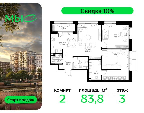 Прямая продажа от застройщика. Продаётся 2-комнатная квартира общей площадью 78.86 м² без отделки в премиальном жилом комплексе "МЫС" на 2-м этаже 12 этажного дома. Квартира расположена в корпусе "Волга". Проект МЫС — это, прежде всего, идеальное место для семей. В рамках проекта построят государственную школу, два детских сада и дворец спорта площадью 20 000 м2 с термальным комплексом, выплывным бассейном, фитнес-залом, теннисными, сквош и падел кортами и секциями для детей. На территории площадью, сравнимой с тремя парками Зарядье, появятся кафе и рестораны, пруд с набережной, спортивные и детские площадки, скейт-парк, лыжные и веломаршруты. Расположение: - 2 минуты до скоростной трассы М1 и Минского шоссе; - 10 минут до МКАД; - 15 минут до МЦД Лесной Городок - 20 минут до делового центра "Москва-Сити"; - 28 минут до аэропорта "Внуково". Благоустройство: - велосипедные и лыжные маршруты; - собственная набережная и парк; - лаунж-зоны в окружении природы; - беседки у очага; - дворец спорта площадью 20 000 м²; - термальный комплекс с тремя бассейнами; - 4 теннисных и падел-корта; - 6 сквош-кортов; - многофункциональный спортзал; - скейт-парк; - просторная площадь для прогулок с фонтаном; - детский Клуб с творческими секциями; - гастро-доминанта; - кафе у пруда, рестораны, ритейл. Окружение - соседство с лесным фондом; - школа на 1250 мест и 2 детских сада на 350 и 255 мест; - Дубковский и Подушкинский леса, парк "Рассказовка", Мещерский парк. Действуют специальные условия при 100% оплате, подробности уточняйте у менеджера в офисе продаж.
