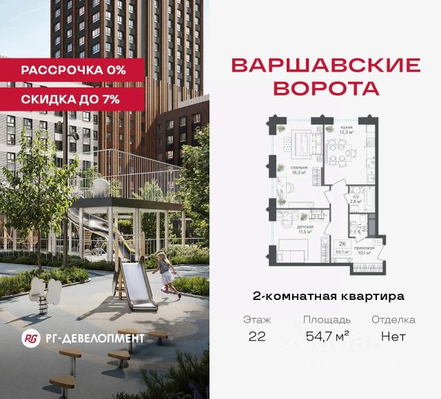 Рассрочка 0% + скидка 5%. Первый платёж 50% при ДДУ, второй 50% — через 12 мес. до ввода ЖК. Продаются 2-комнатные апартаменты 54,3 кв.м. в МФК "Варшавские ворота" на 2-м этаже 9 этажного дома. МФК "Варшавские ворота" — это проект, в котором учтен широкий спектр требований: от транспортной доступности и развитой инфраструктуры до архитектурной выразительности и экологического окружения. Апартаменты в МФК "Варшавские ворота" подойдут для тех, кто ищет продуманное жилье в Москве или готовый инвестиционный актив. Апартаменты здесь — это: - возможность жить комфортно в удобном городском формате — с природой, метро, сервисом и паркингом; - возможность купить лот с готовой отделкой, чтобы вложить минимальные инвестиции в ремонт и получить максимум возможностей от сдачи; - экономия на налоге на имущество, кадастровая стоимость апартаментов ниже ~ на 30% кадастровой стоимости квартиры; - высокая инвестиционная доходность объекта за счет более низкой цены покупки по сравнению с квартирой. Коротко о важном: - 1 минута пешком от м. Аннино; - Удобные выезды на Варшавское шоссе и МКАД; - Вид из окон на Битцевский лес и Аннинский лесопарк; - Высота потолков 2,7 - 3 м; - Закрытый двор-парк; - Школы и детские сады в 10-15 минутах пешком от дома; - Технические лоджии для размещения кондиционеров; - Подземный паркинг; - РГ-Девелопмент — ТОП-20 крупнейших застройщиков России. Проект сочетает в себе современную архитектуру и продуманное благоустройство с уникальным природным окружением. Всего в нескольких минутах от дома — девять парков, каскад прудов и крупнейшие лесопарковые зоны Москвы, создающие ощущение жизни в зеленом оазисе посреди мегаполиса. Архитектурная концепция - стиль Чикаго в Москве. Выполнена в минималистичной эстетике с использованием клинкера и декоративного кирпича. Фасады подчеркивают строгие линии и современный стиль, а входные группы разработаны московским бюро Syntaxis. Лобби оформлены с применением керамогранита, декоративной штукатурки и гипсовых панелей, детали из латуни добавляют изысканности. Пространство оживляют гербарии, композиции из сухоцветов и авторские панно. Проект находится в одной минуте пешком от метро "Аннино", в 12 минутах от станции "Улица Академика Янгеля" и рядом с МЦД-2 "Красный Строитель". Для автомобилистов предусмотрен прямой выезд на Варшавское шоссе и два съезда на МКАД, что позволяет быстро добираться в любую часть города. Среди планировочных решений представлены разнообразные форматы: от функциональных студий до просторных 4-комнатных квартир и апартаментов площадью от 22 до 105 м². Высокие потолки усиливают ощущение простора, а продуманные планировки включают мастер-спальни, гардеробные, угловые окна, объединённые кухни-гостиные и несколько санузлов. Центральное пространство комплекса — закрытый двор без машин. Он разделён на функциональные зоны: детские игровые комплексы, спортивные площадки, воркаут-зоны и уютные места для тихого отдыха. На первых этажах разместя