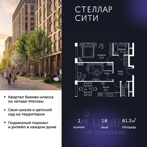 Продается квартира от надежного застройщика Tashir Estate в квартале бизнес-класса Stellar City в ЗАО Москвы. Площадь квартиры составляет: 53.6 кв. м, потолки: 3.1 м Квартира находится на 13 этаже, 4 корпуса жилого квартала Stellar City — микрогорода будущего на орбите Москвы. Stellar City — квартал в ЗАО Москвы вблизи инновационного центра Сколково. В окружении — 11 парков и природных зон, в том числе Долина реки Сетунь, Мещерский лес и парк развлечений The Rink. Город в городе Чтобы дом и инфраструктура вокруг отвечала динамичному лайфстайлу жителя мегаполиса, в основу проекта легла концепция город в городе, которая позволяет решать все бытовые вопросы in-home. В квартале будут возведены школа и детский сад, воркаут-зоны, променад, вело и беговые дорожки, детские площадки для каждого корпуса, а также коммерция на первых этажах для ежедневных покупок. Все необходимое — на расстоянии нескольких шагов. Изящные и лаконичные лобби Авторский дизайн, натуральные материалы в отделке и безупречный интерьер вне времени. Лобби и холлы в проекте бизнес-класса Stellar City ничем не отличаются от входных групп в премиум-сегменте благодаря качественным европейским материалам в отделке, стильному дизайну, консьерж-сервису и уютной зоне ожидания с журнальными столиками и мягкой мебелью. Комфорт и безопасность Закрытая территория, охрана, система СКУД, специально разработанное мобильное приложение дома для резидентов и подземный паркинг с круглосуточным наблюдением и доступом с помощью автоматического считывания номера авто.