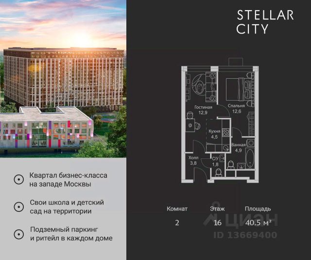 Продается квартира от надежного застройщика Tashir Estate в квартале бизнес-класса Stellar City в ЗАО Москвы. Площадь квартиры составляет: 40.5 кв. м, потолки: 2.9 м Квартира находится на 16 этаже, 4 корпуса жилого квартала Stellar City — микрогорода будущего на орбите Москвы. Stellar City — квартал в ЗАО Москвы вблизи инновационного центра Сколково. В окружении — 11 парков и природных зон, в том числе Долина реки Сетунь, Мещерский лес и парк развлечений The Rink. Город в городе Чтобы дом и инфраструктура вокруг отвечала динамичному лайфстайлу жителя мегаполиса, в основу проекта легла концепция город в городе, которая позволяет решать все бытовые вопросы in-home. В квартале будут возведены школа и детский сад, воркаут-зоны, променад, вело и беговые дорожки, детские площадки для каждого корпуса, а также коммерция на первых этажах для ежедневных покупок. Все необходимое — на расстоянии нескольких шагов. Изящные и лаконичные лобби Авторский дизайн, натуральные материалы в отделке и безупречный интерьер вне времени. Лобби и холлы в проекте бизнес-класса Stellar City ничем не отличаются от входных групп в премиум-сегменте благодаря качественным европейским материалам в отделке, стильному дизайну, консьерж-сервису и уютной зоне ожидания с журнальными столиками и мягкой мебелью. Комфорт и безопасность Закрытая территория, охрана, система СКУД, специально разработанное мобильное приложение дома для резидентов и подземный паркинг с круглосуточным наблюдением и доступом с помощью автоматического считывания номера авто.